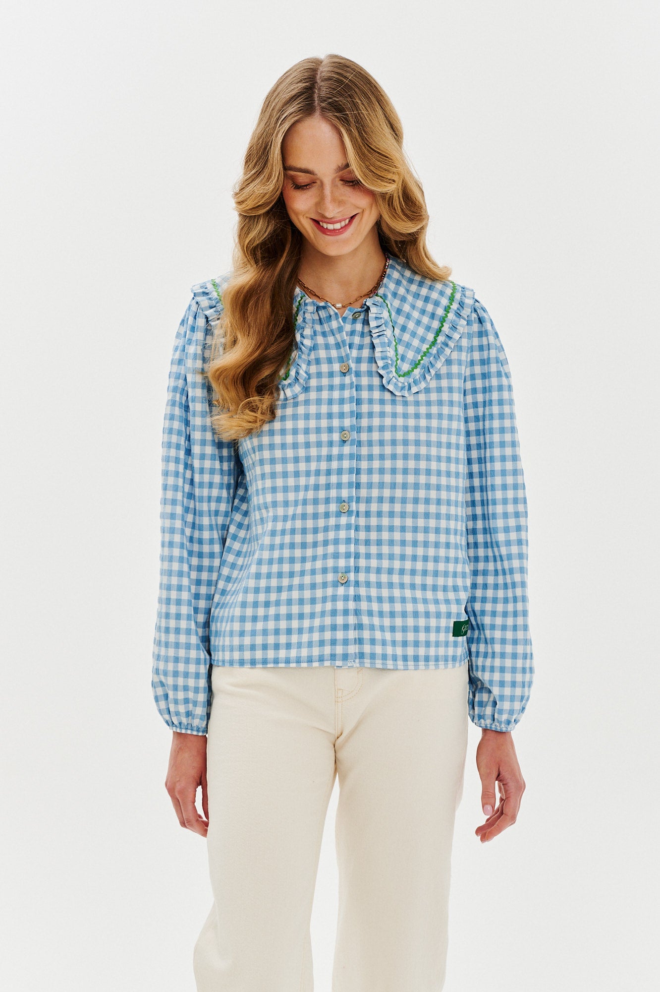 Koszula Blush Ocean w błękitną kratkę, ozdobiona falowanym kołnierzem z zieloną lamówką, to kwintesencja subtelnej nonszalancji. Idealna na wiosenne poranki i letnie wieczory, kiedy chcesz czuć się wyjątkowo, ale bez wysiłku. To model, który doskonale odnajdzie się zarówno w codziennym looku z jeansami, jak i w bardziej romantycznej odsłonie – np. w duecie ze spódnicą i balerinami.