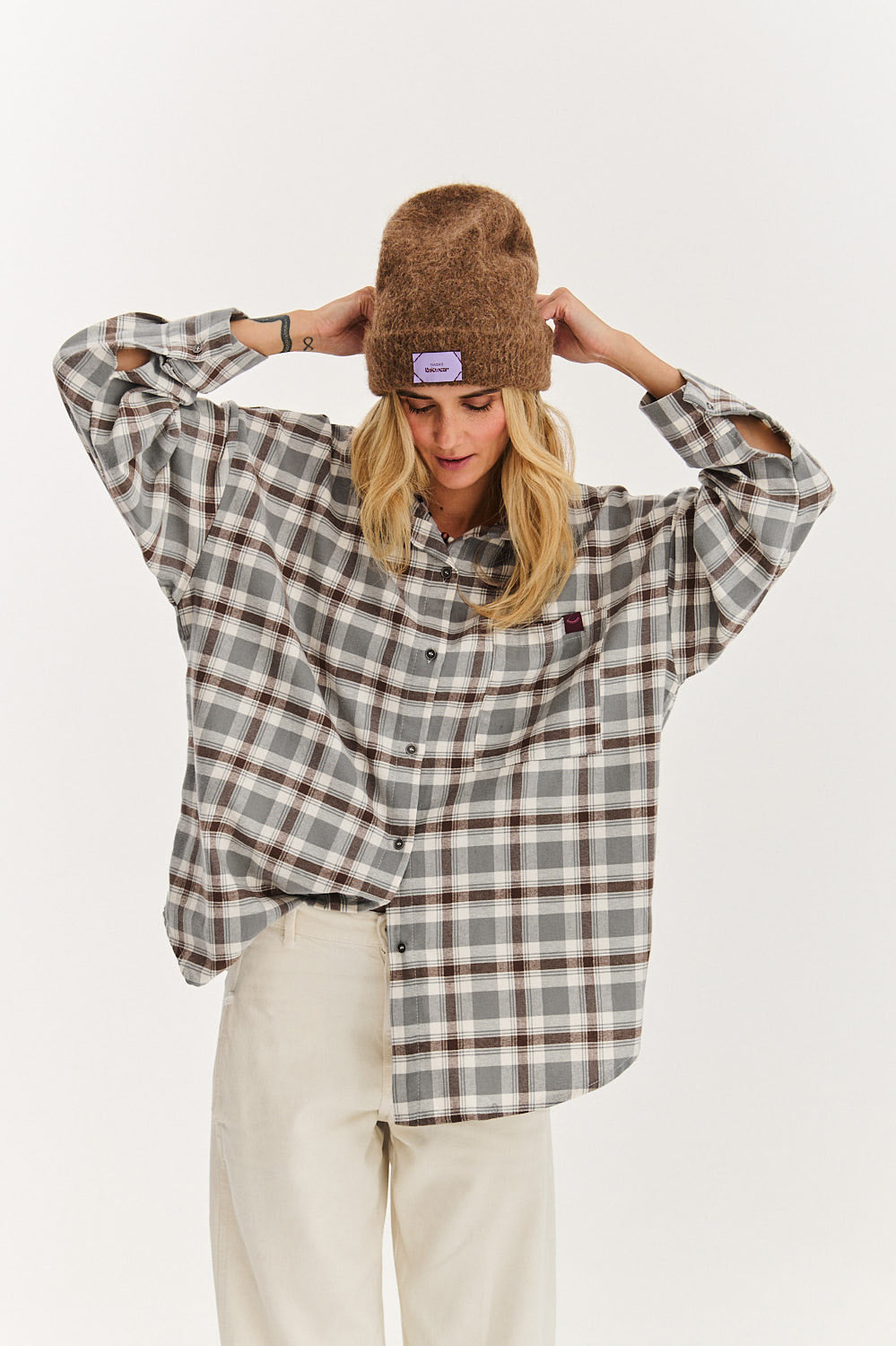 Koszula flanelowa Tender Silence to niezbędnik w każdej jesienno-zimowej szafie. Klasyczny model zachwyca miękkością i ponadczasowym wzorem w kratę. Stonowana kolorystyka łącząca brązy, szarości i beże została przełamana subtelną, bordową linią.