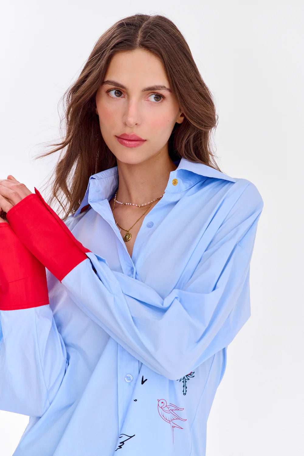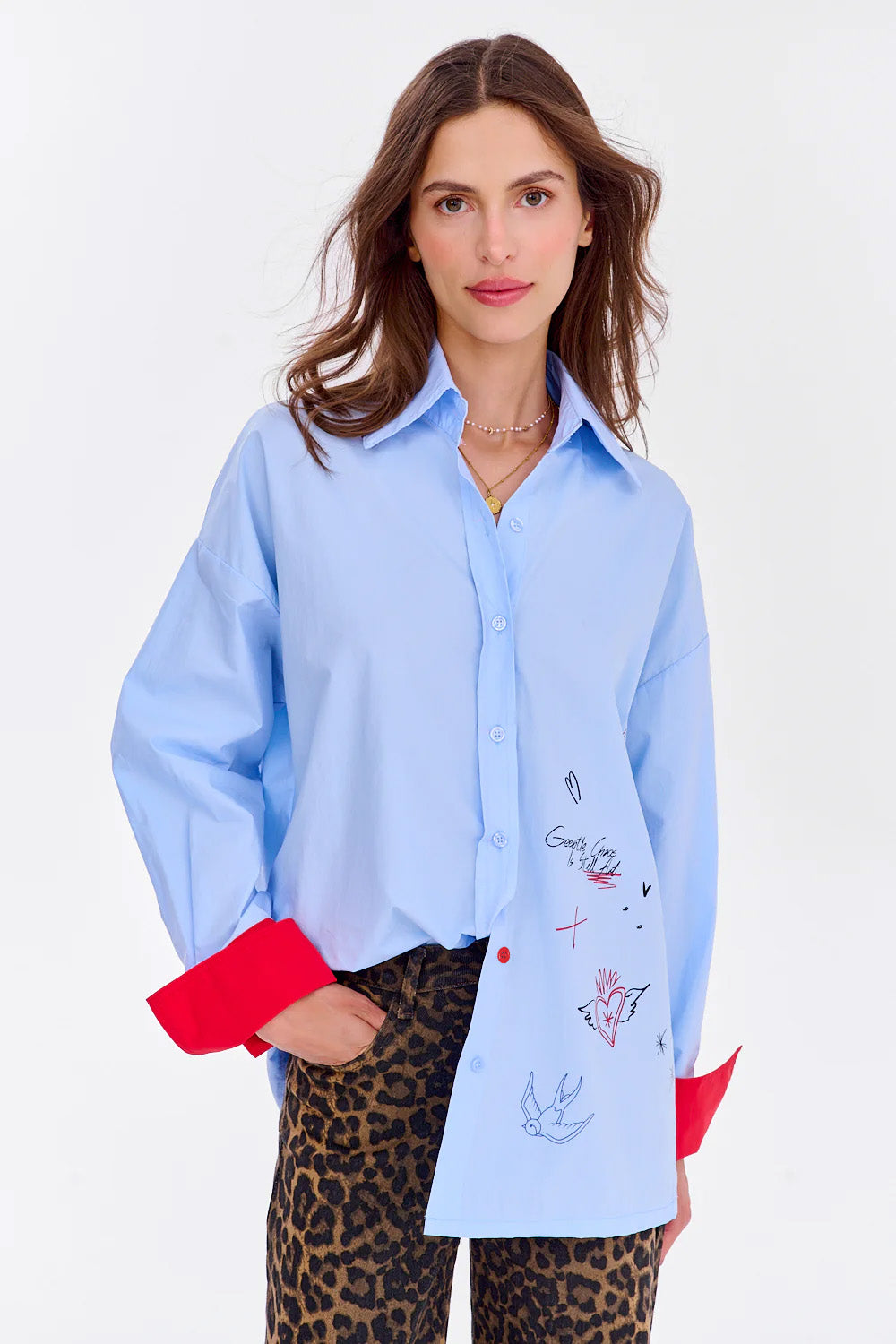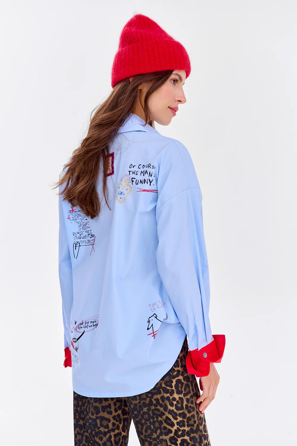 Luźny krój sprawia, że koszula doskonale układa się na sylwetce i zapewnia komfort noszenia. Autorskie ilustracje i hasła nawiązujące do pozytywnych emocji dodają jej artystycznego, unikatowego charakteru. Wyraziste, czerwone mankiety oraz kontrastowe guziki przełamują klasyczną formę i czynią ją jeszcze bardziej wyjątkową.