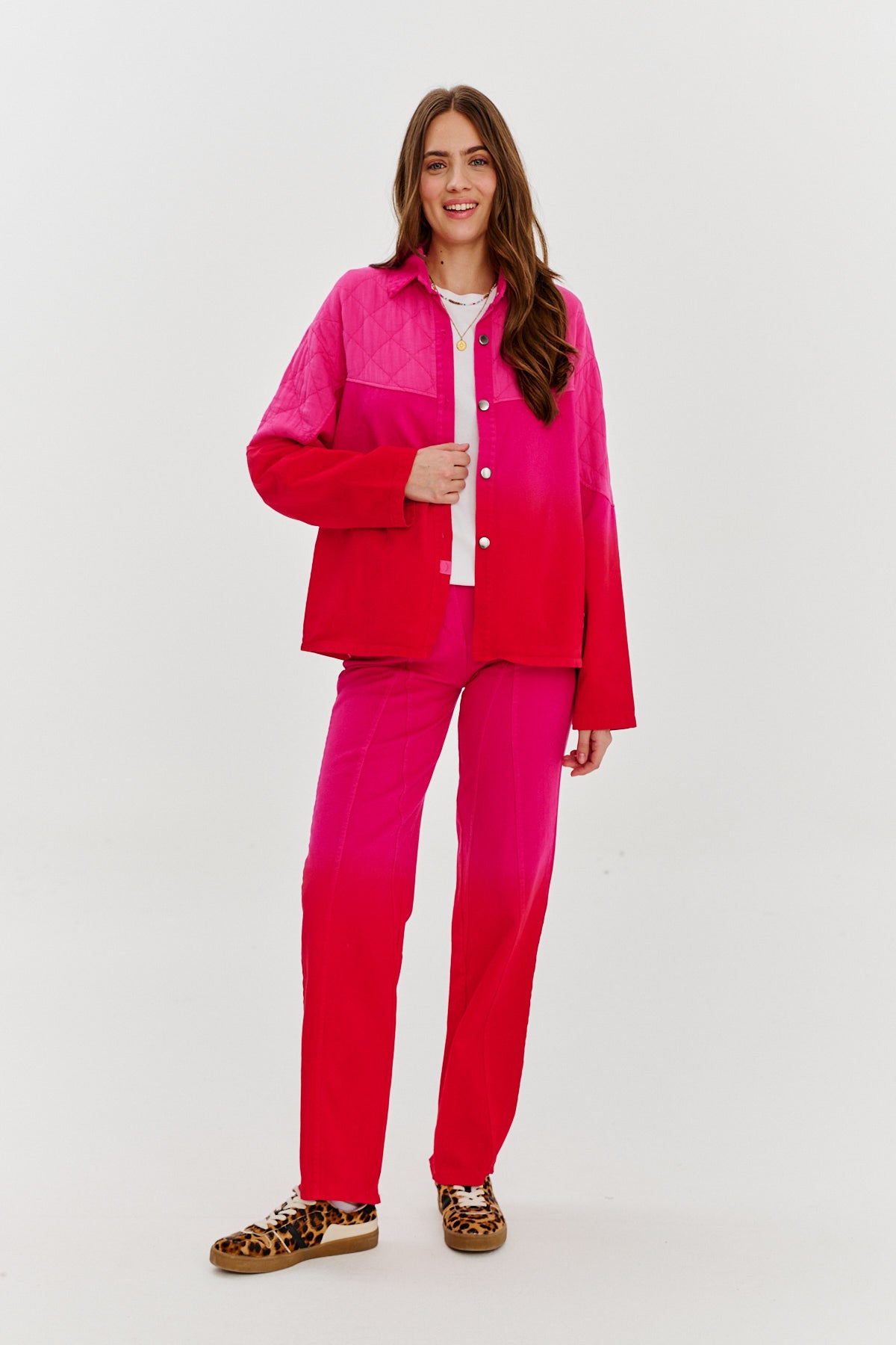 Koszula Love on Fire to połączenie klasycznej formy z nowoczesnym, energetycznym designem. Różowo-czerwony efekt ombre przyciąga spojrzenia, a pikowane detale na ramionach dodają unikalnego charakteru. Wykonana z wysokiej jakości materiału, zapewnia wygodę i swobodę ruchów.