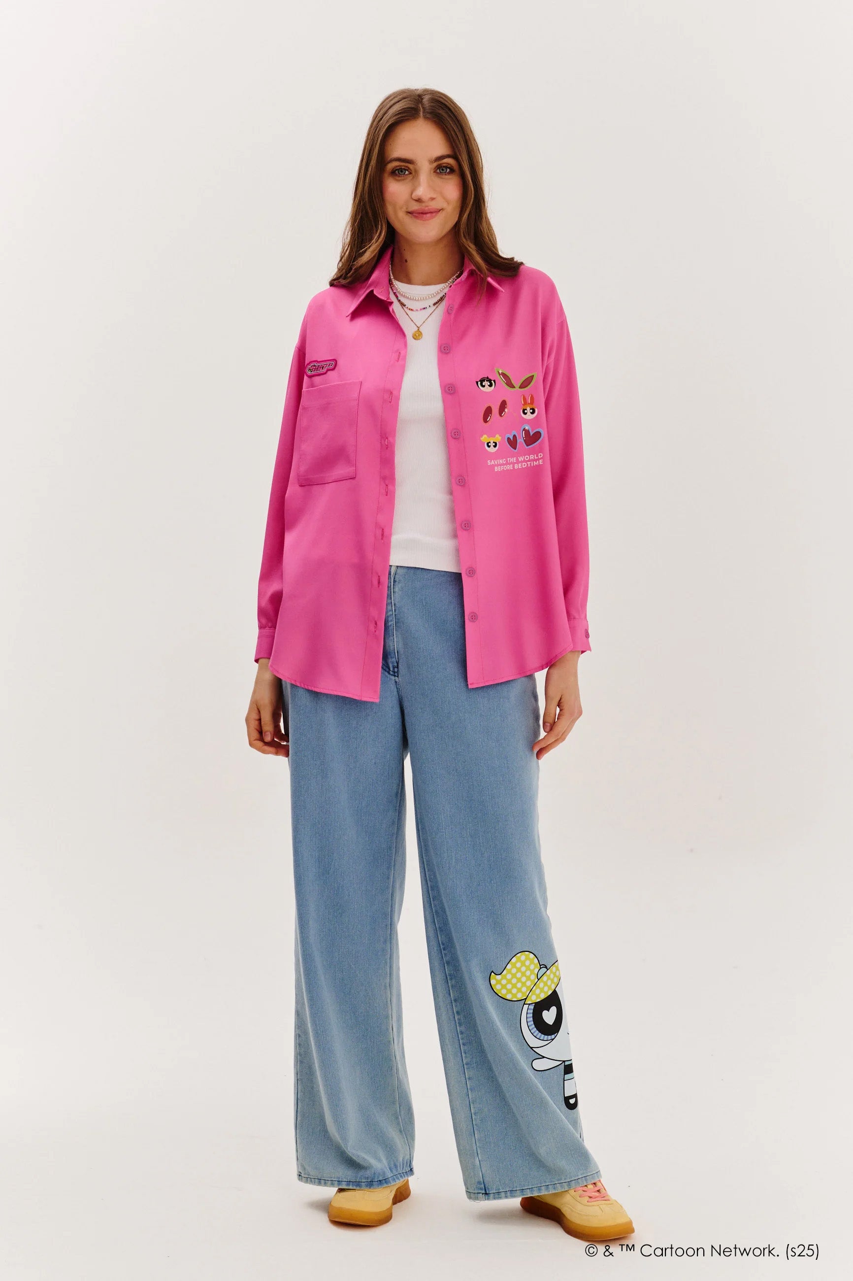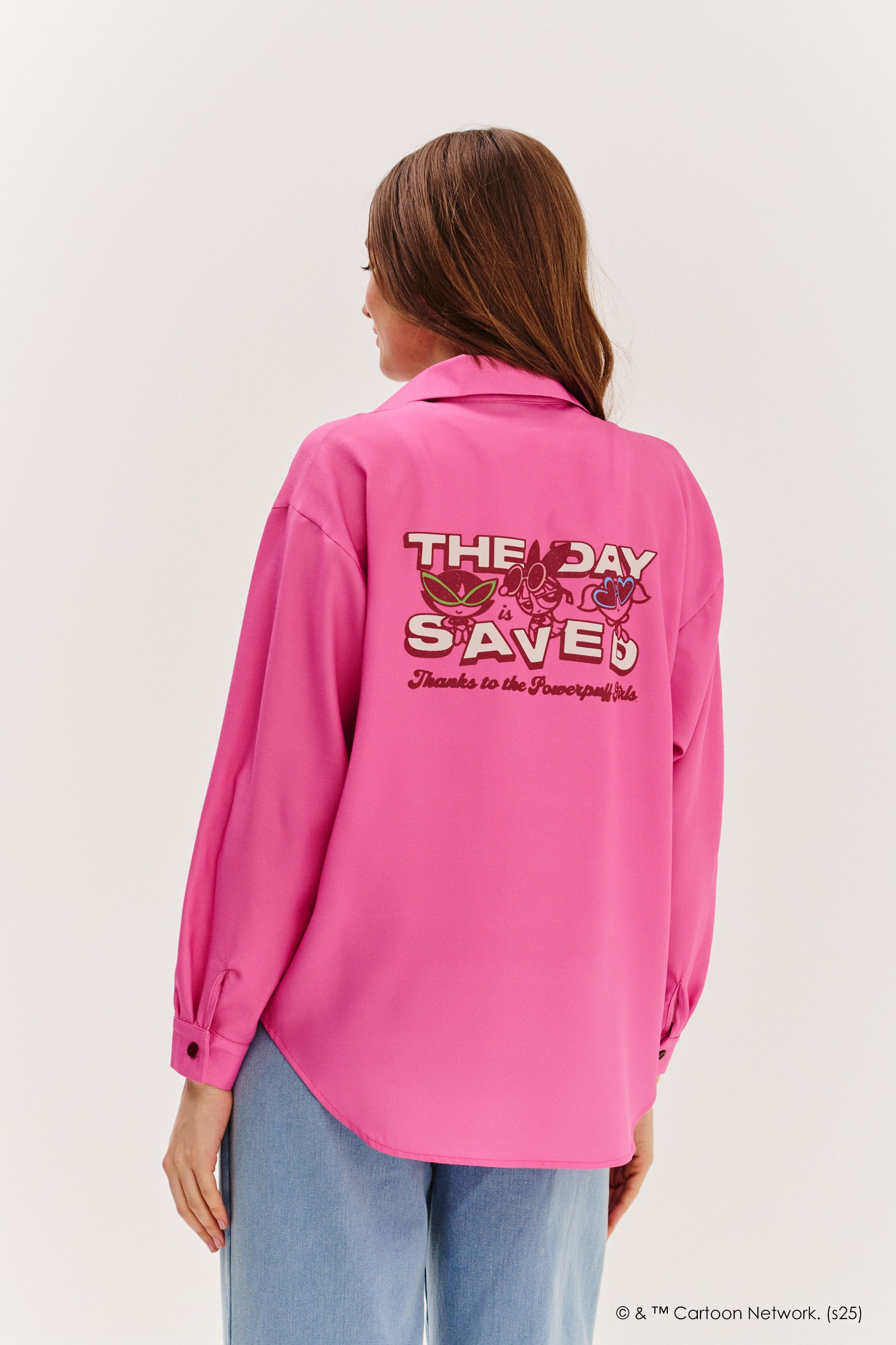 Koszula Save The Day to różowy manifest girl power w wydaniu, które pokochasz od pierwszego założenia. Klasyczny, luźny krój został przełamany bajkowym twistem – z przodu znajdziesz hafty przedstawiające Atomówki i hasło "Saving the world before bedtime", a z tyłu kultowy nadruk "The day is saved – thanks to the Powerpuff Girls".