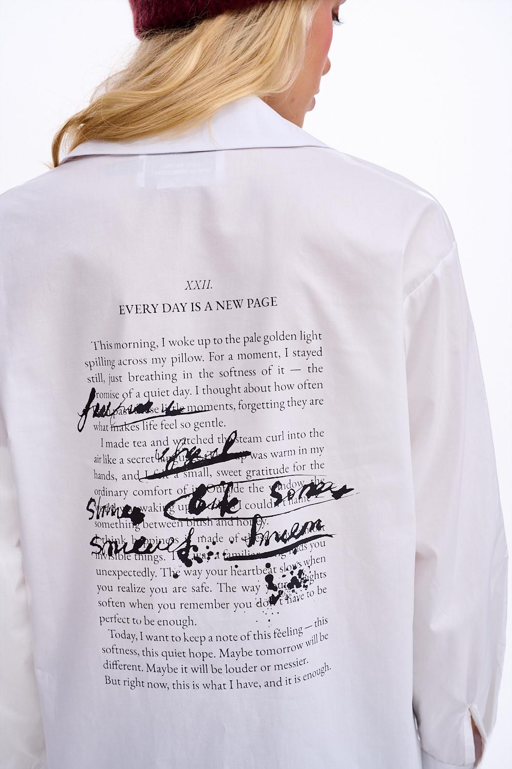 Z przodu znajdziesz drobne aplikacje w formie haftowanych i drukowanych motywów inspirowanych notatkami, kolażami i ręcznymi zapiskami, które wprowadzają kreatywny, nieoczywisty akcent. Tył koszuli zdobi nadruk przypominający kartkę z dziennika: motyw tekstu, skreśleń i osobistych refleksji zachęca do wyrażania siebie, łapania momentów i celebrowania codzienności.
