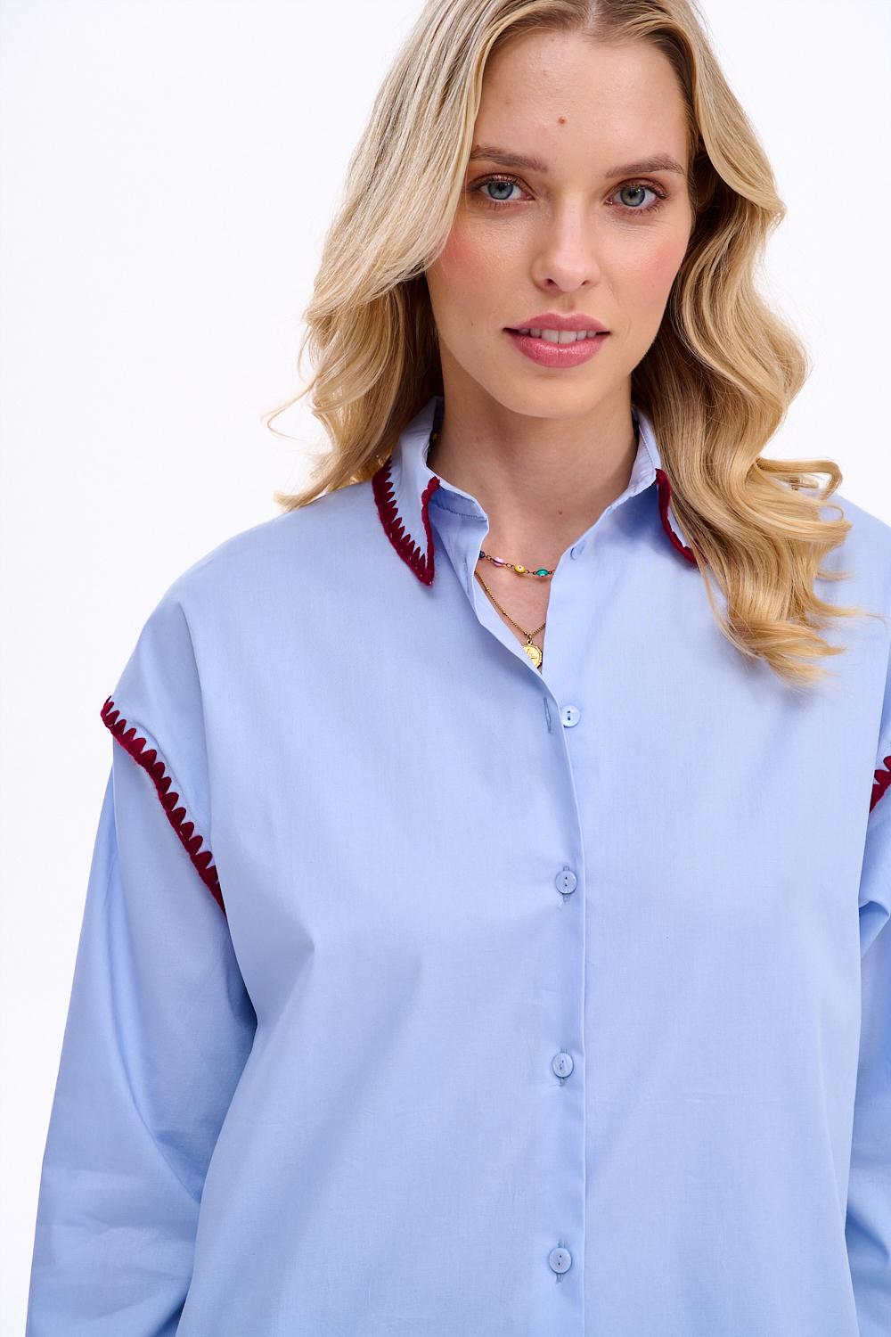 Ta koszula to doskonała baza do wielu stylizacji. Noś ją wpuszczoną w spodnie z wysokim stanem, by stworzyć elegancki look, lub luźno, w połączeniu z jeansami, dla bardziej swobodnego efektu. Błękitny kolor pięknie podkreśli każdy typ urody.