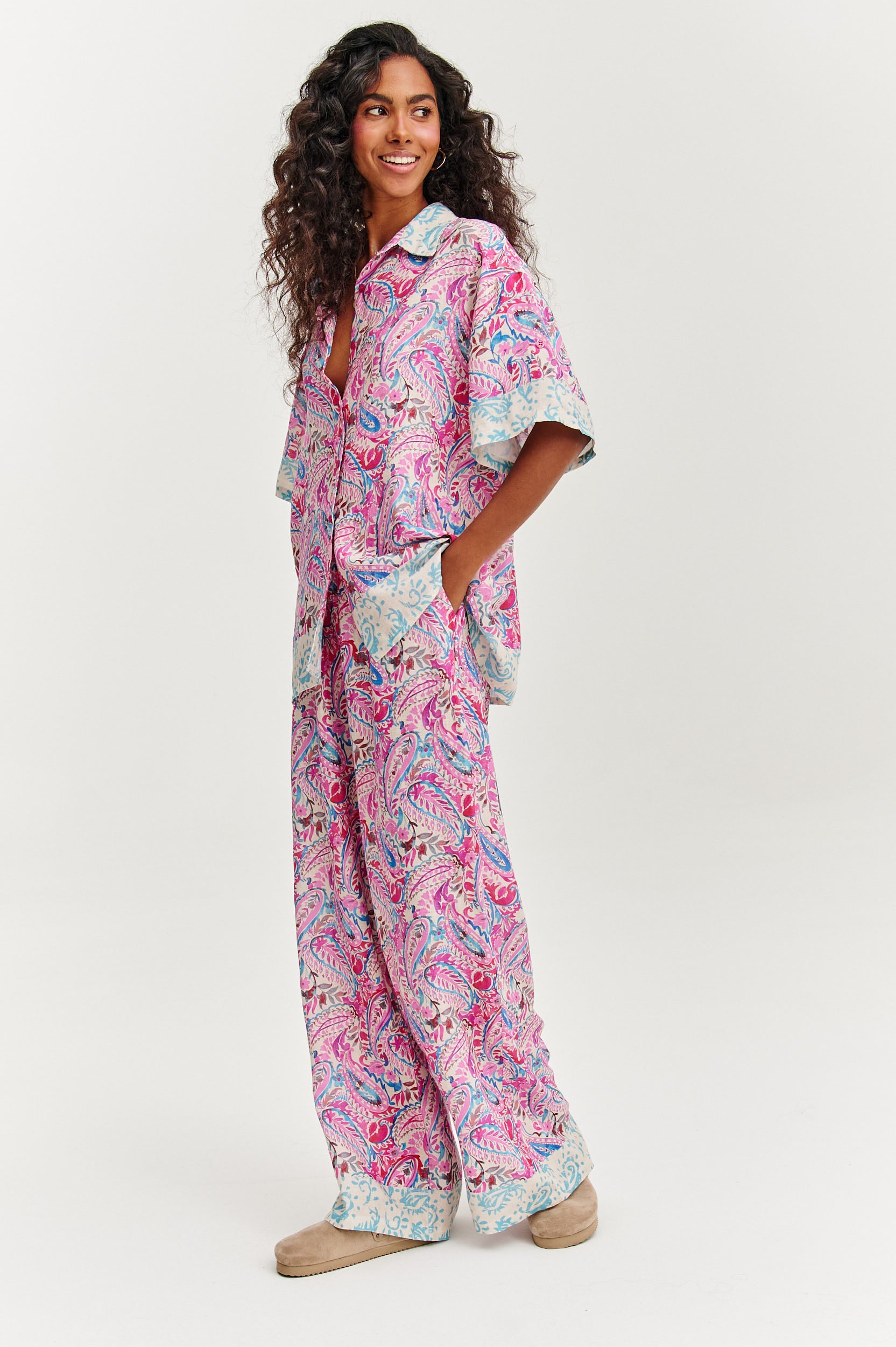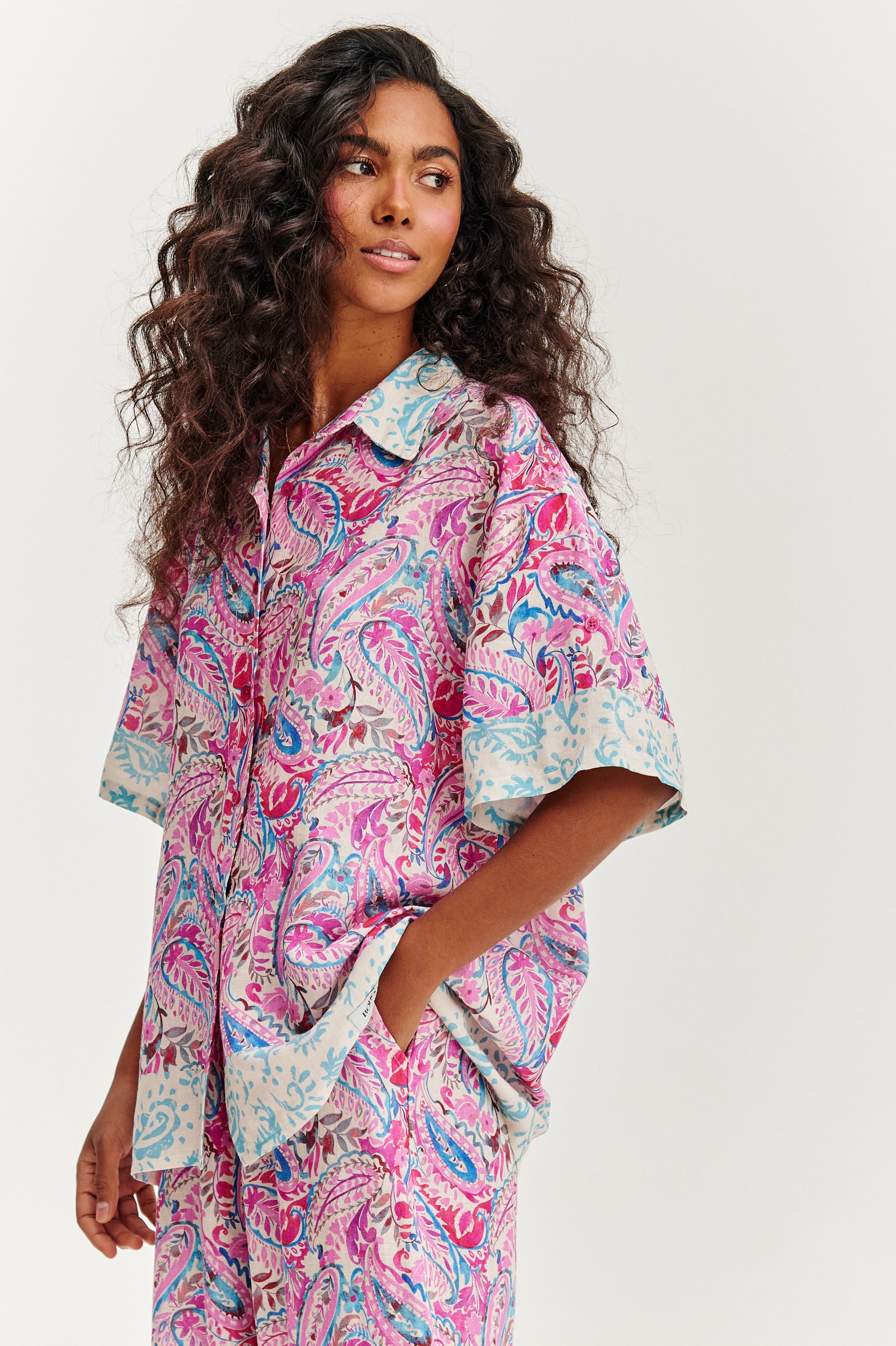 Koszula z lnem Pink Rodeo to nie tylko ubranie – to manifest kolorów, energii i swobody. To idealny balans między wygodą a wyrazistym stylem. Nasycone barwy, inspirowane printem paisley i florystycznymi ornamentami, tworzą kolorowy wzór, który natychmiast przyciąga wzrok. Krótki rękaw, luźny fason i klasyczny kołnierzyk nadają jej codzienny, ale wciąż wyjątkowy charakter.