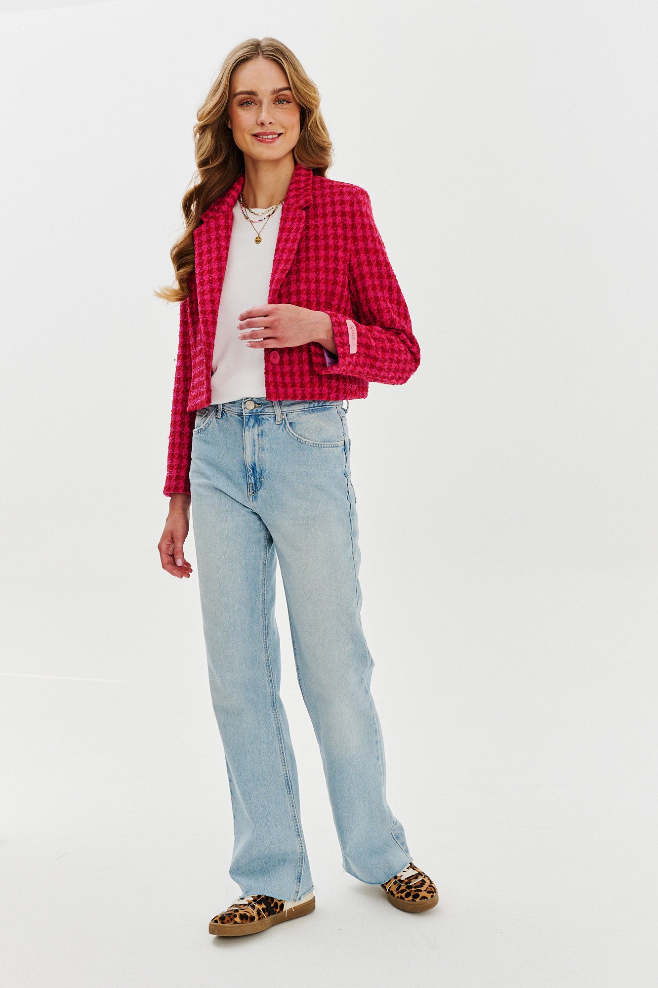 Krótka marynarka Sugar Rush – różowa energia w eleganckim wydaniu! Zanurz się w świecie stylowej słodyczy! Ten model to hołd dla odwagi w modzie – intensywnie różowa pepitka spotyka klasyczny fason, tworząc duet, który trudno przeoczyć. Marynarka została wykonana z tweedowego materiału.