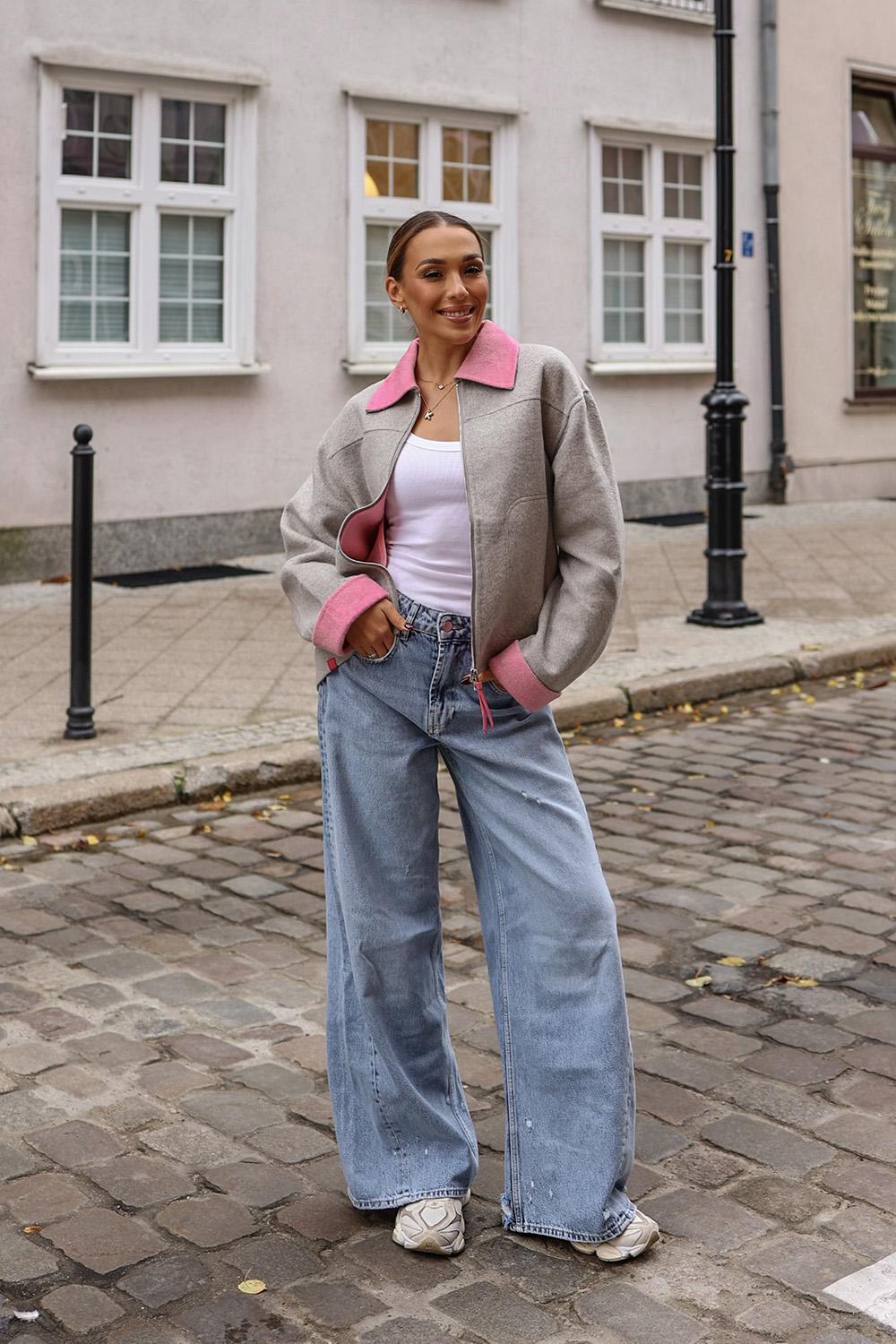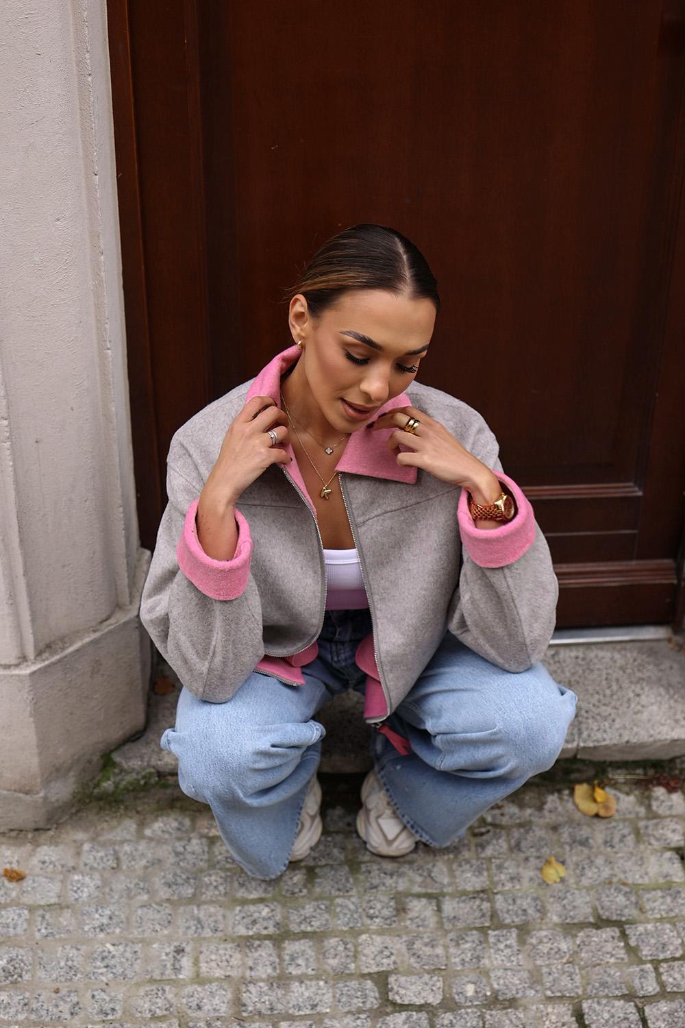 Kurtka z wełną Candy Glow to połączenie minimalizmu i energetycznego akcentu, które od razu poprawia nastrój. Jej stonowana, szara baza została przełamana różowymi detalami – kołnierzem, mankietami i podszyciem – co nadaje całości lekkości i dziewczęcego charakteru. Prosty, pudełkowy krój z praktycznym zapięciem na suwak i dużymi kieszeniami sprawia, że to model idealny na co dzień.