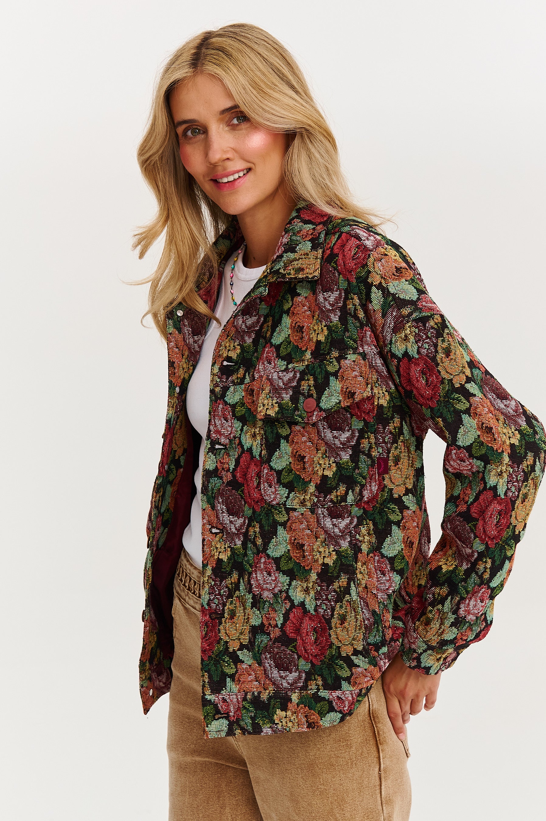Kurtka City of Roses to niepowtarzalny model, który łączy miejską energię z romantycznym charakterem. Uszyta z wysokogatunkowej tkaniny żakardowej, przyciąga uwagę bogatym wzorem w kwiaty, tworząc wyjątkowy efekt inspirowany klimatem vintage i współczesną nonszalancją. Kurtka z klasycznym kołnierzem i prostym fasonem sprawdzi się zarówno w codziennych stylizacjach, jak i jako główny element bardziej wyrazistych zestawów.