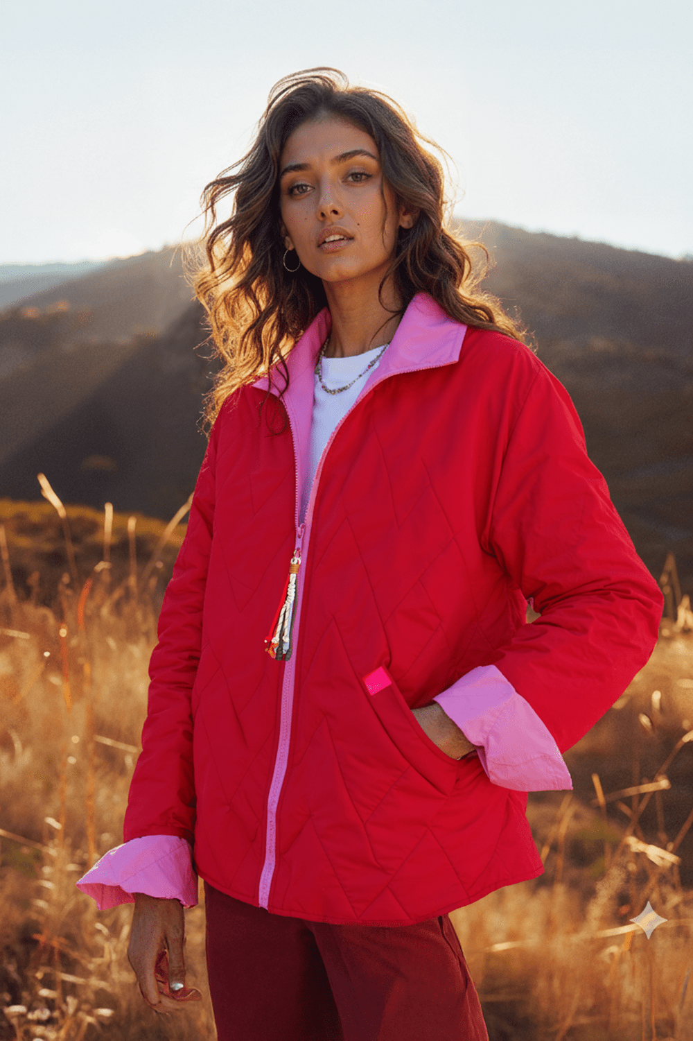 Kurtka dwustronna Poppy Strawberry Sorbet to manifest koloru, odwagi i kobiecej siły. Nasycona czerwień z zygzakowym pikowaniem spotyka się z intensywnym różem, tworząc duet, który nie zna kompromisów. A jeśli zechcesz wyciszyć stylizację, wystarczy... odwrócić ją na drugą stronę.