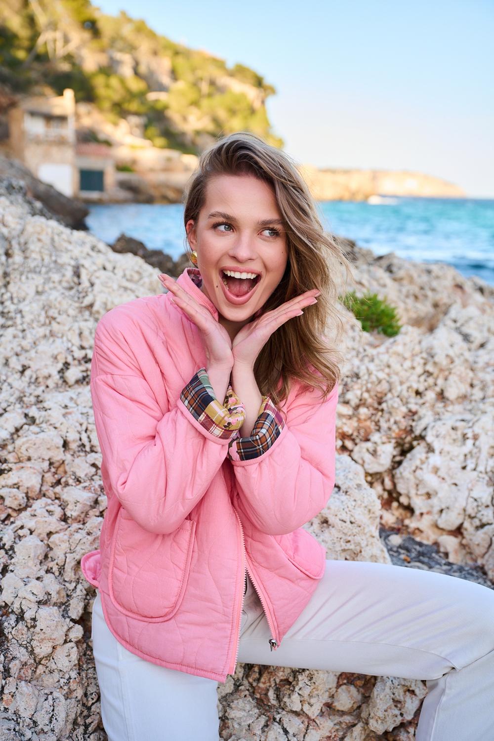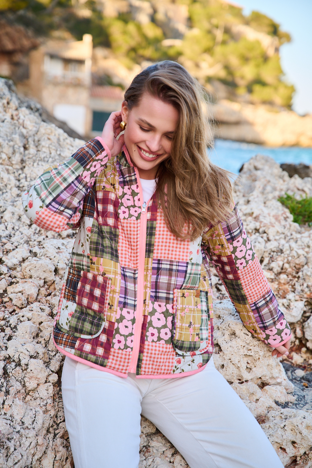 Czas na odrobinę wiosennej świeżości! Kurtka dwustronna Spring Me Up to połączenie romantycznego vintage i nowoczesnego patchworku – idealna dla kobiet, które kochają modową zabawę i zmienność stylu. Jedna strona to subtelna, pikowana faktura w odcieniu pudrowego różu – delikatna, kobieca i minimalistyczna. Druga to prawdziwa uczta dla oczu – patchworkowy miszmasz kwiatowych i kraciastych wzorów, które wprowadzą nutę retro w Twoje stylizacje.