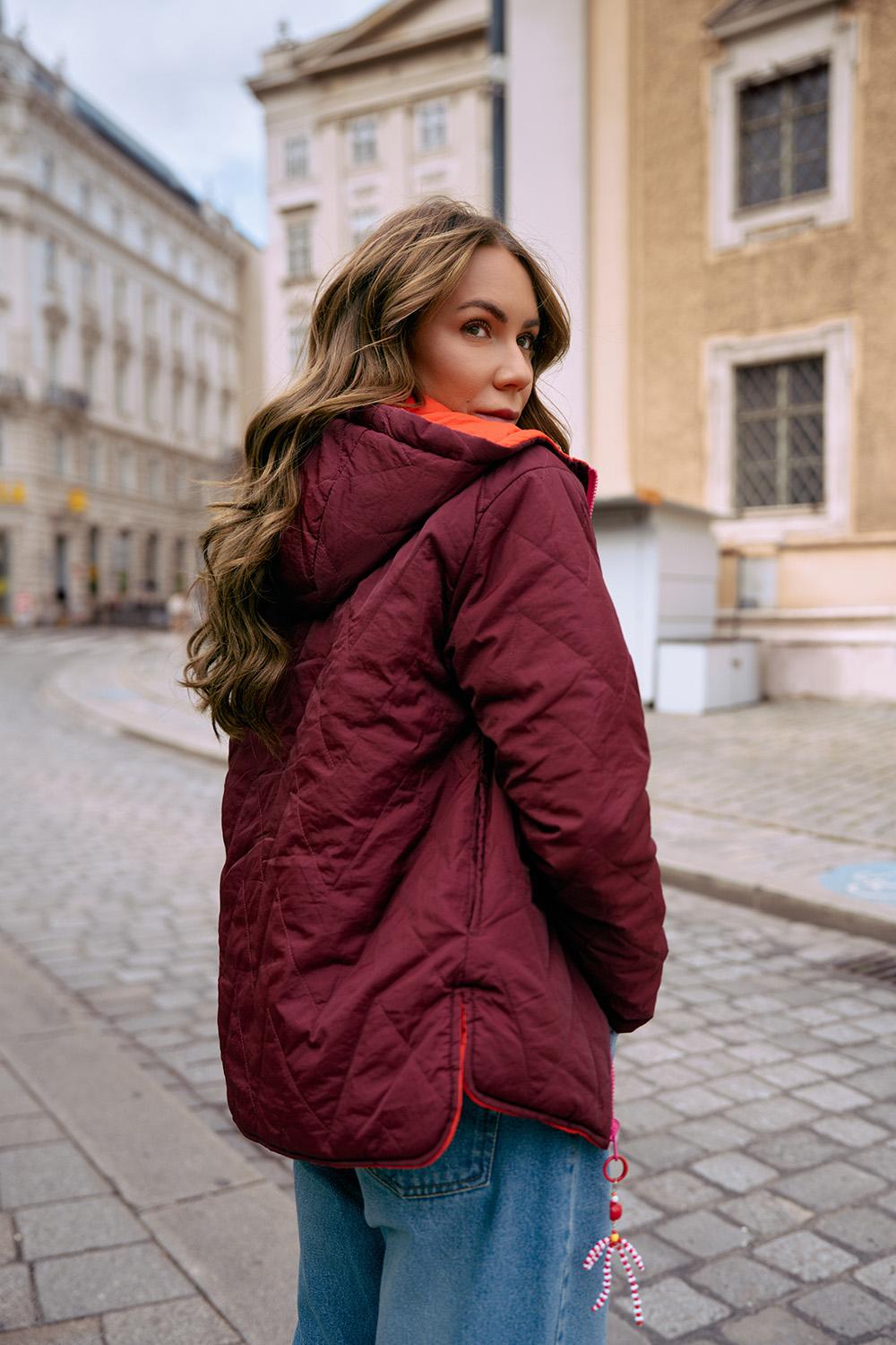 Kurtka dwustronna z kapturem Poppy Loud Love to propozycja dla wszystkich, którzy lubią wyraziste akcenty i praktyczne rozwiązania na chłodniejsze dni. Z jednej strony urzeka energetyczną czerwienią z ozdobnymi przeszyciami i kontrastowymi detalami przy kieszeniach oraz mankietach, a z drugiej – głęboki, śliwkowy odcień zachwyca subtelną strukturą i nowoczesnym, geometrycznym pikowaniem. Miękkość materiału oraz lekkość wypełnienia sprawiają, że kurtka jest niezwykle komfortowa, a dzięki kapturowi sprawdzi się nawet podczas wietrznej pogody.