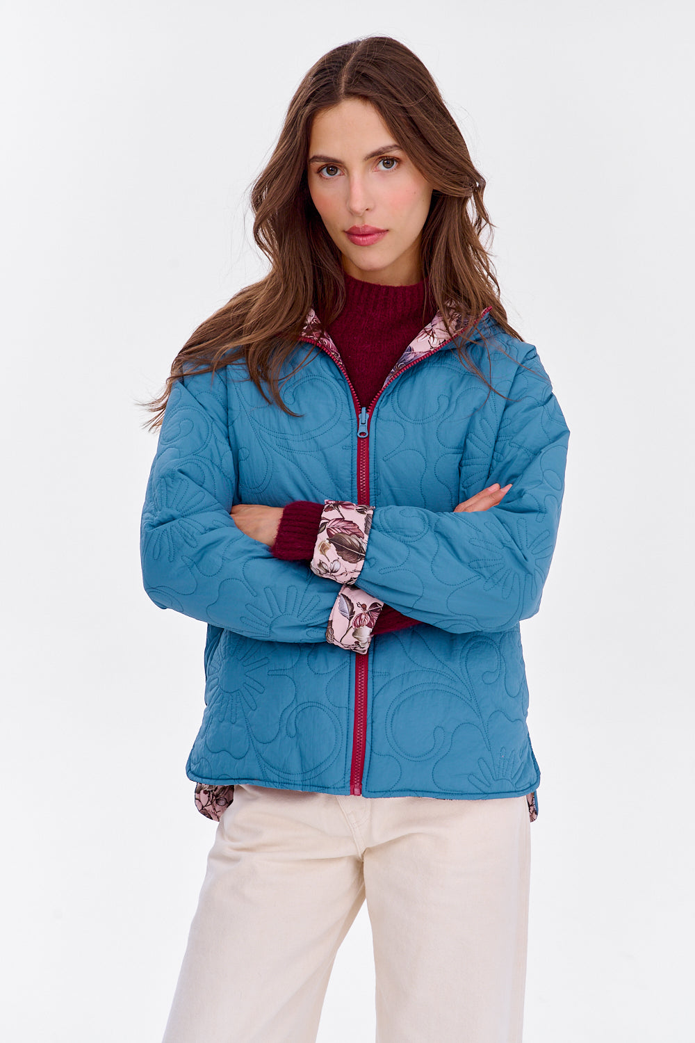 Kurtka dwustronna z kapturem Poppy Mystic Garden to manifest odwagi i stylu na jesienne i zimowe dni. Z jednej strony zgaszony kolor niebieski przełamany kontrastowymi przeszyciami i wykończeniami w kwiaty, z drugiej kwiatowy wzór. Klasyczna forma z kapturem i pikowaniem tworzy ultra wygodny, otulający fason, który możesz stylizować na dwa sposoby, w zależności od nastroju lub pogody.
