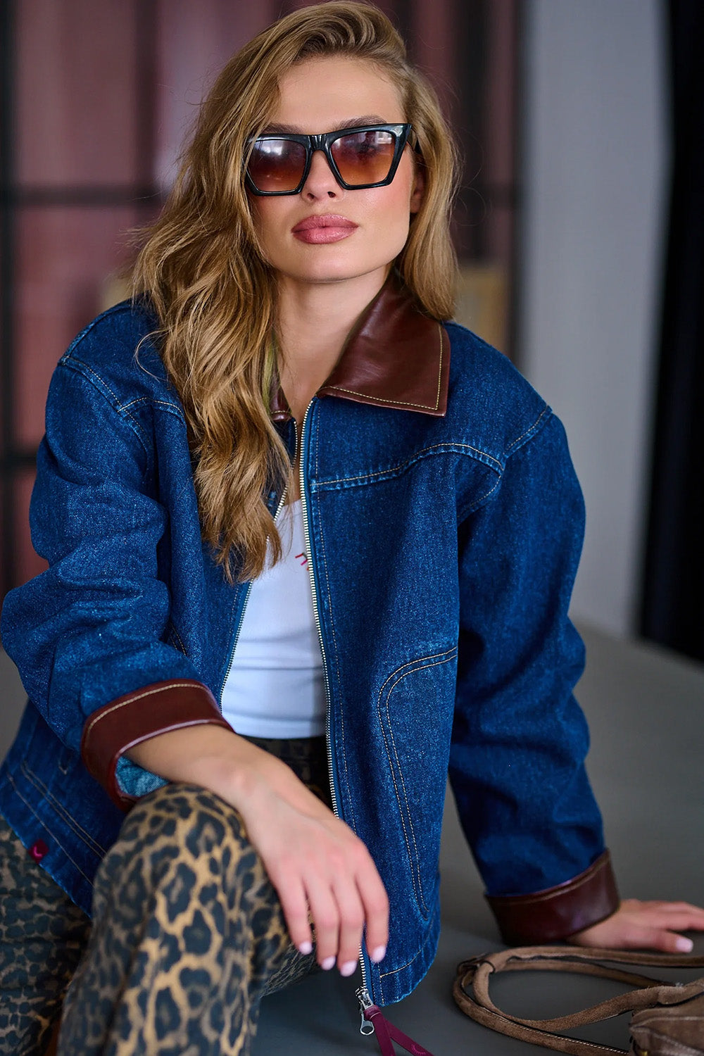 Kurtka jeansowa Deep Mood to nowa odsłona kultowego fasonu, stworzona z myślą o kobietach ceniących ponadczasowy styl i wygodę. Kurtka ma luźny krój, zapinana jest na zamek błyskawiczny. Kontrastowe, bordowe wykończenia przy szyi, na mankietach i wewnątrz dodają jej oryginalnego charakteru, idealnie komponując się z granatowym denimem. Dwie kieszenie z przodu podkreślają jej praktyczny, a zarazem stylowy charakter.