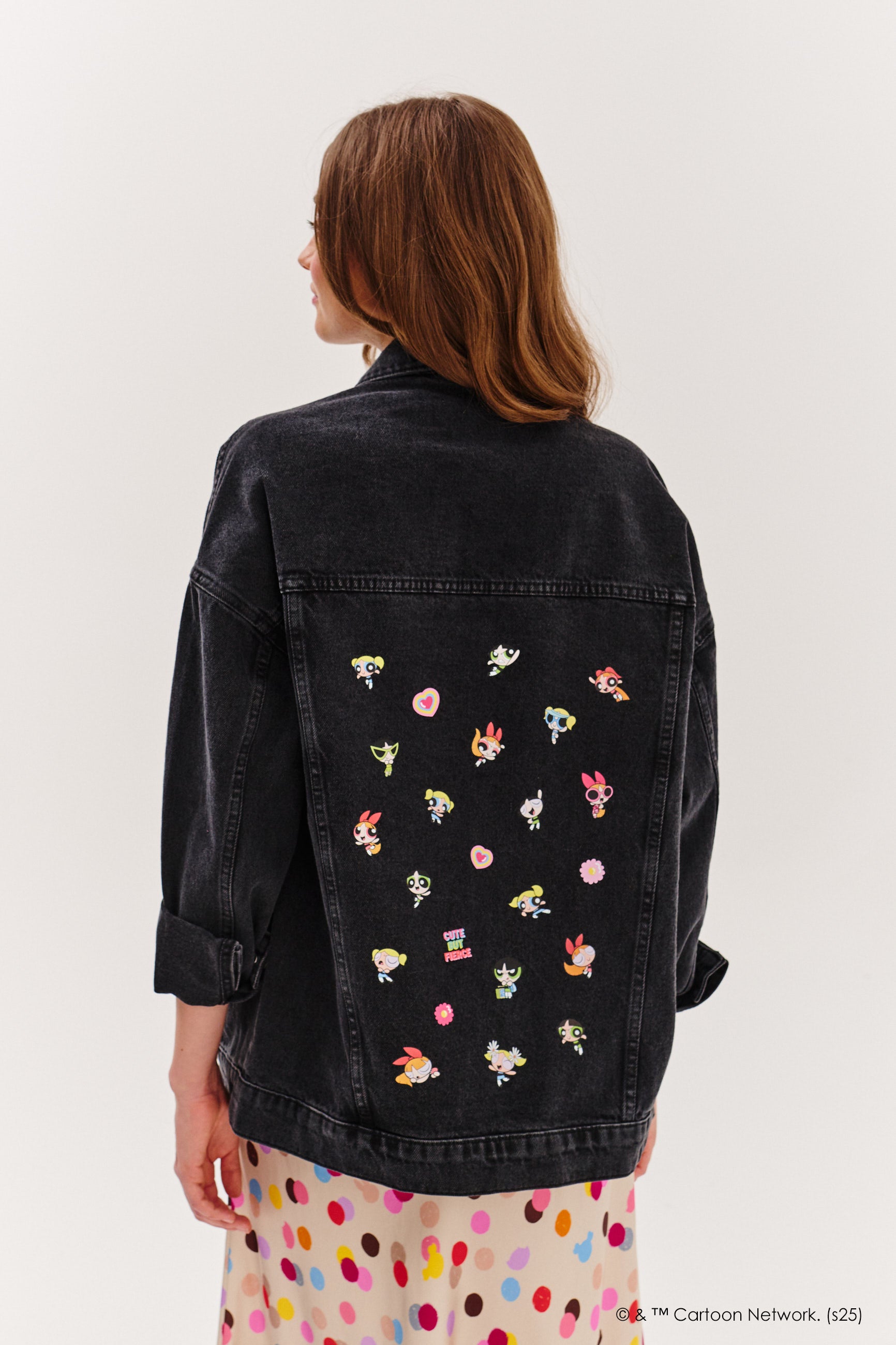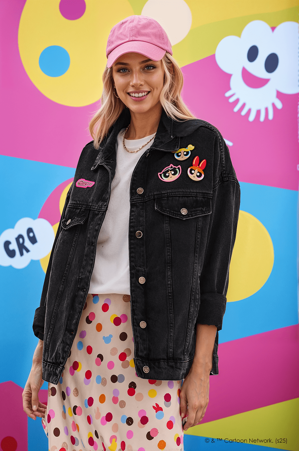 Kurtka jeansowa Girl Power to klasyk z mocnym, animowanym twistem! Ciemny denim i kultowy fason zostały wzbogacone o kolorowe naszywki z Atomówkami – na froncie znajdziesz trio Blossom, Bubbles i Buttercup, a na plecach całą energetyczną ekipę w akcji.