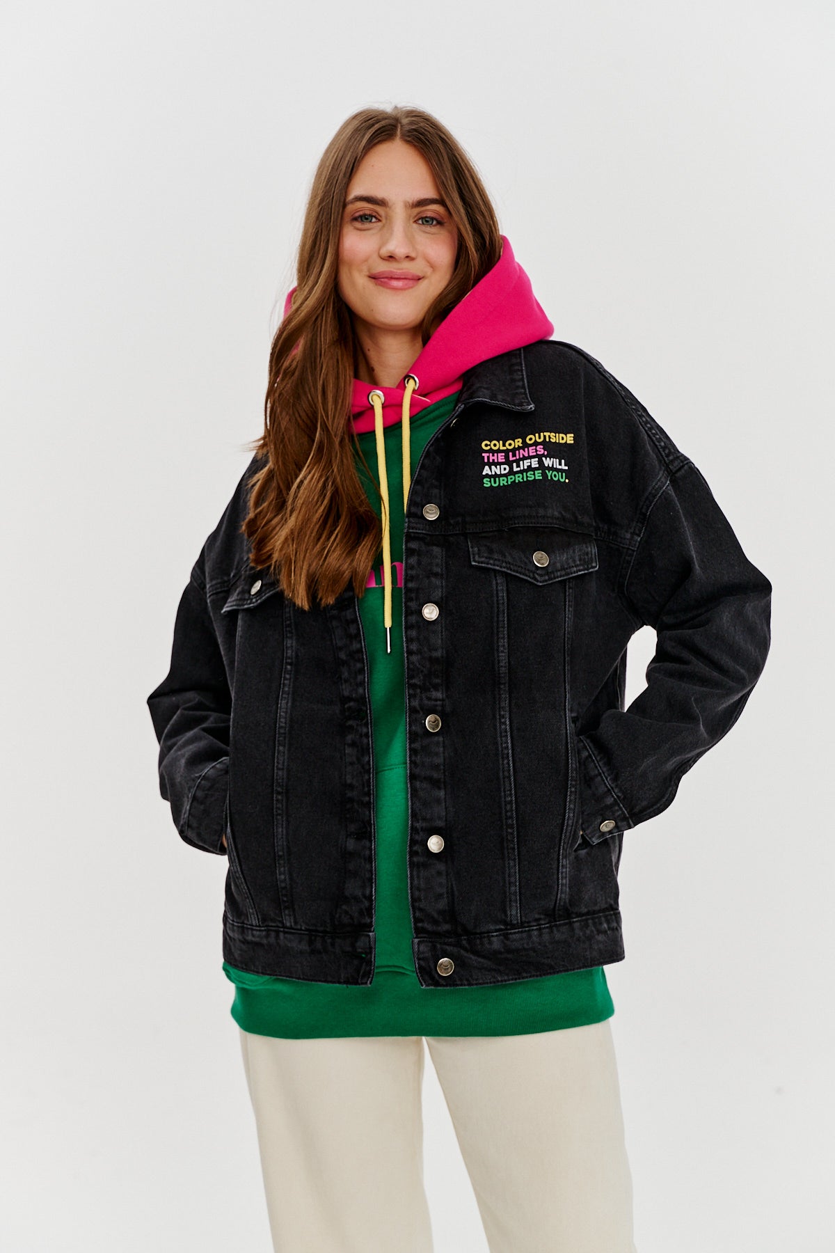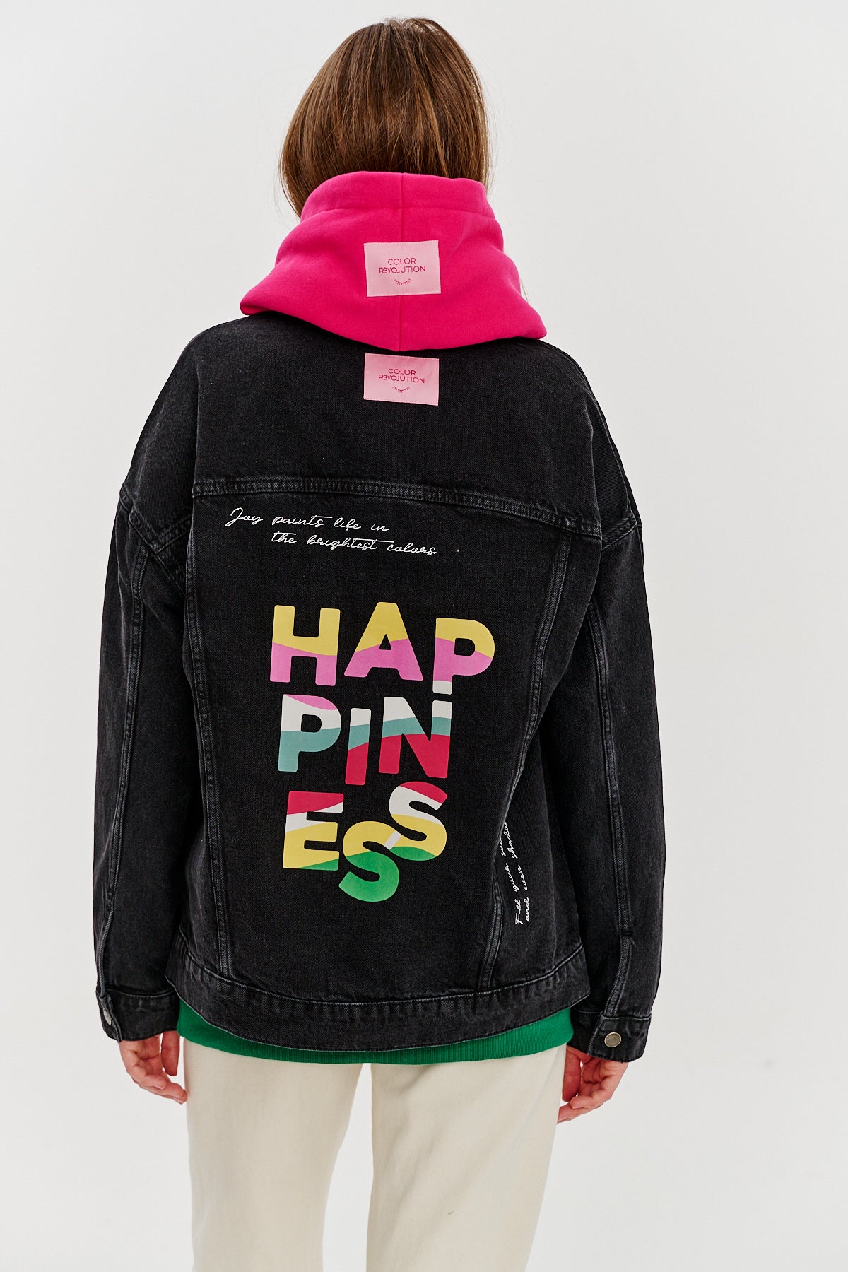 Kurtka jeansowa Happiness to połączenie klasycznej formy i odważnych, pozytywnych detali, które wyróżnią Cię w tłumie. Czarna baza nadaje jej uniwersalności i rockowego charakteru, a kolorowe napisy i inspirujące hasła dodają jej wyjątkowego uroku.
