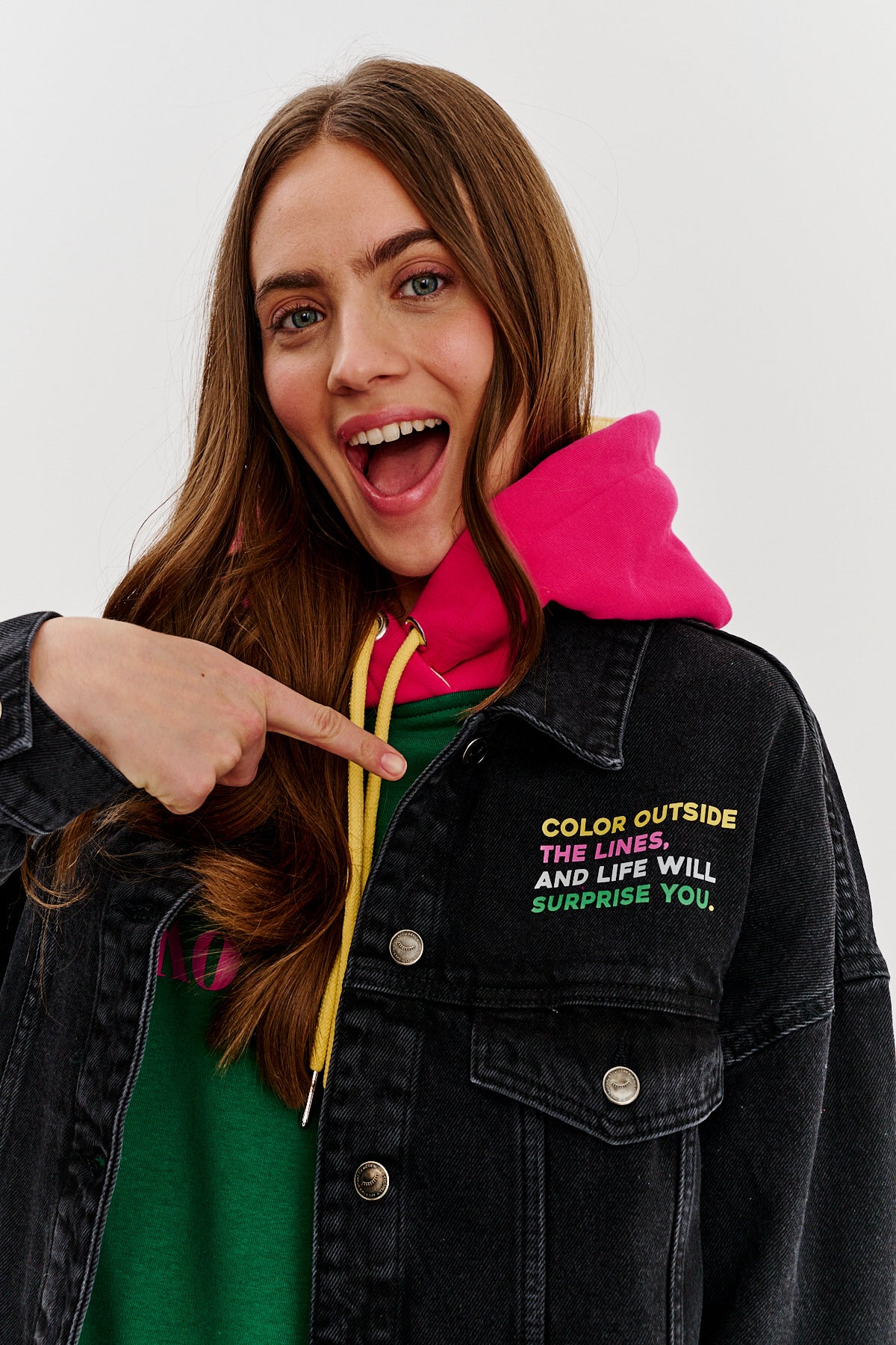 Z przodu znajduje się subtelny, motywacyjny cytat: Color outside the lines and life will surprise you – idealne przypomnienie, by żyć po swojemu i wychodzić poza schematy. Tył kurtki zdobi wielokolorowy napis Happiness, który podkreśla pozytywne wibracje i celebrację codziennych chwil radości.