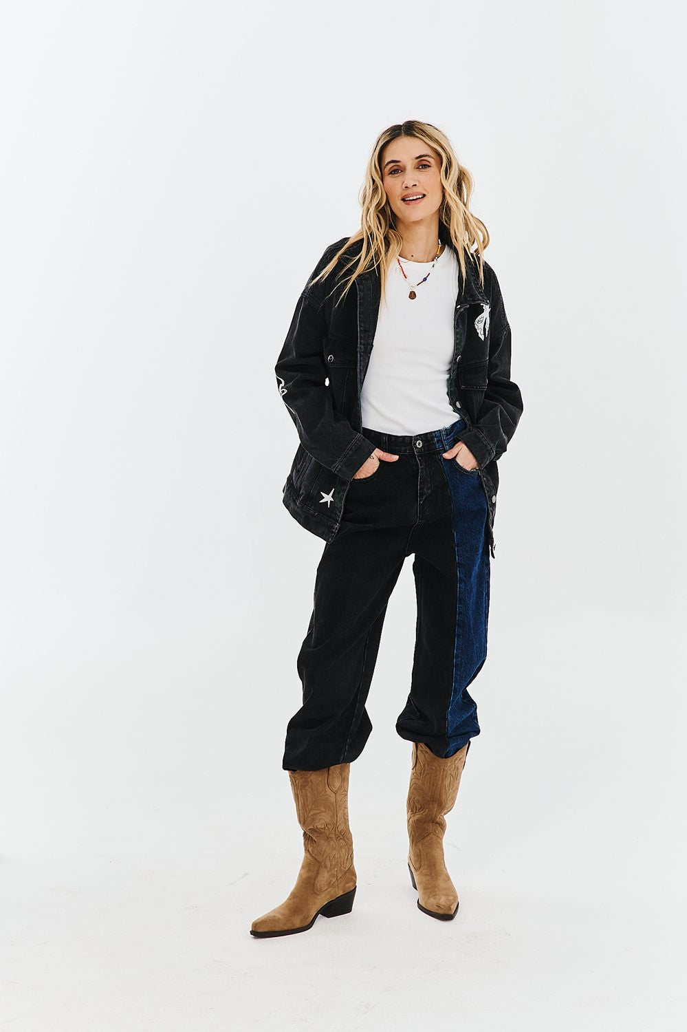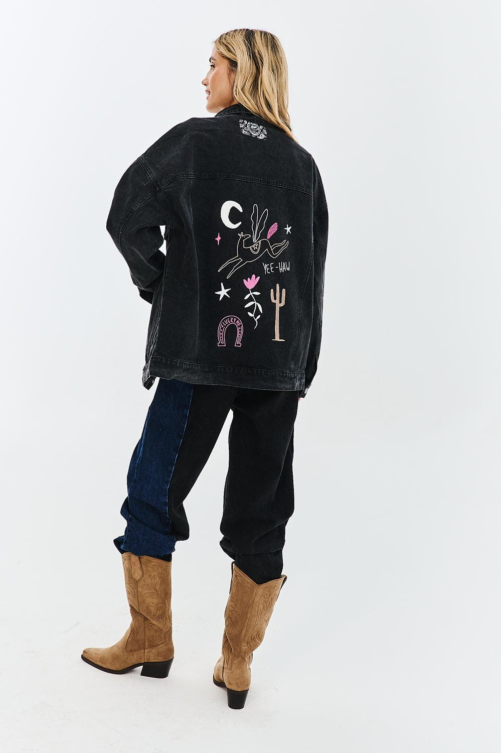 To nie jest zwykła katana. Yeehaw Dreams przyciąga wzrok detalami: od białych gwiazd i błyskawic na rękawach, po rozbudowaną, kolorową kompozycję na plecach z motywem księżyca, kaktusa i napisem „YEE-HAW”. Kurtka posiada praktyczne kieszenie piersiowe oraz metalowe guziki. Świetnie sprawdzi się w zestawieniu z jeansami typu patchwork, tworząc odważny total look, lub jako narzutka na zwiewną sukienkę w stylu boho.