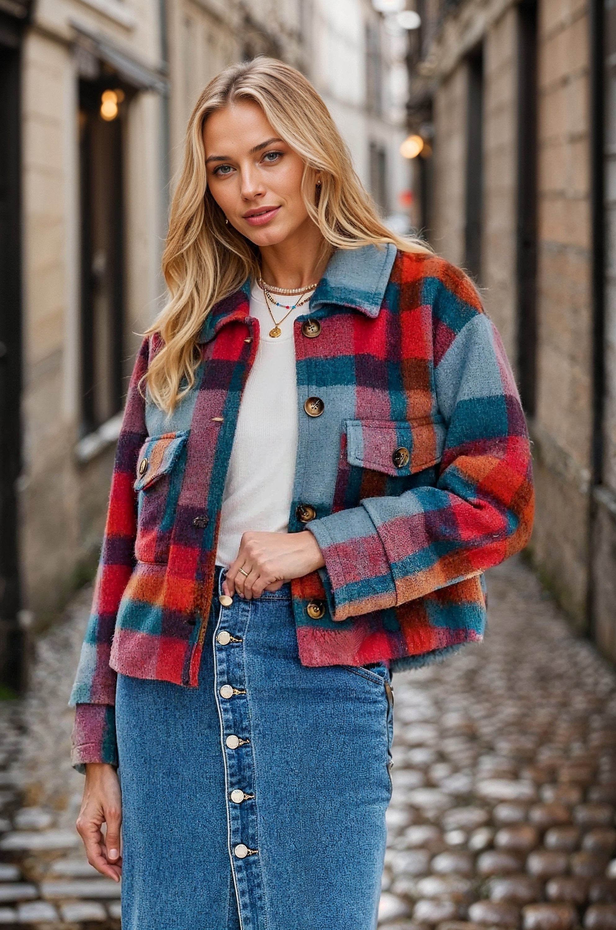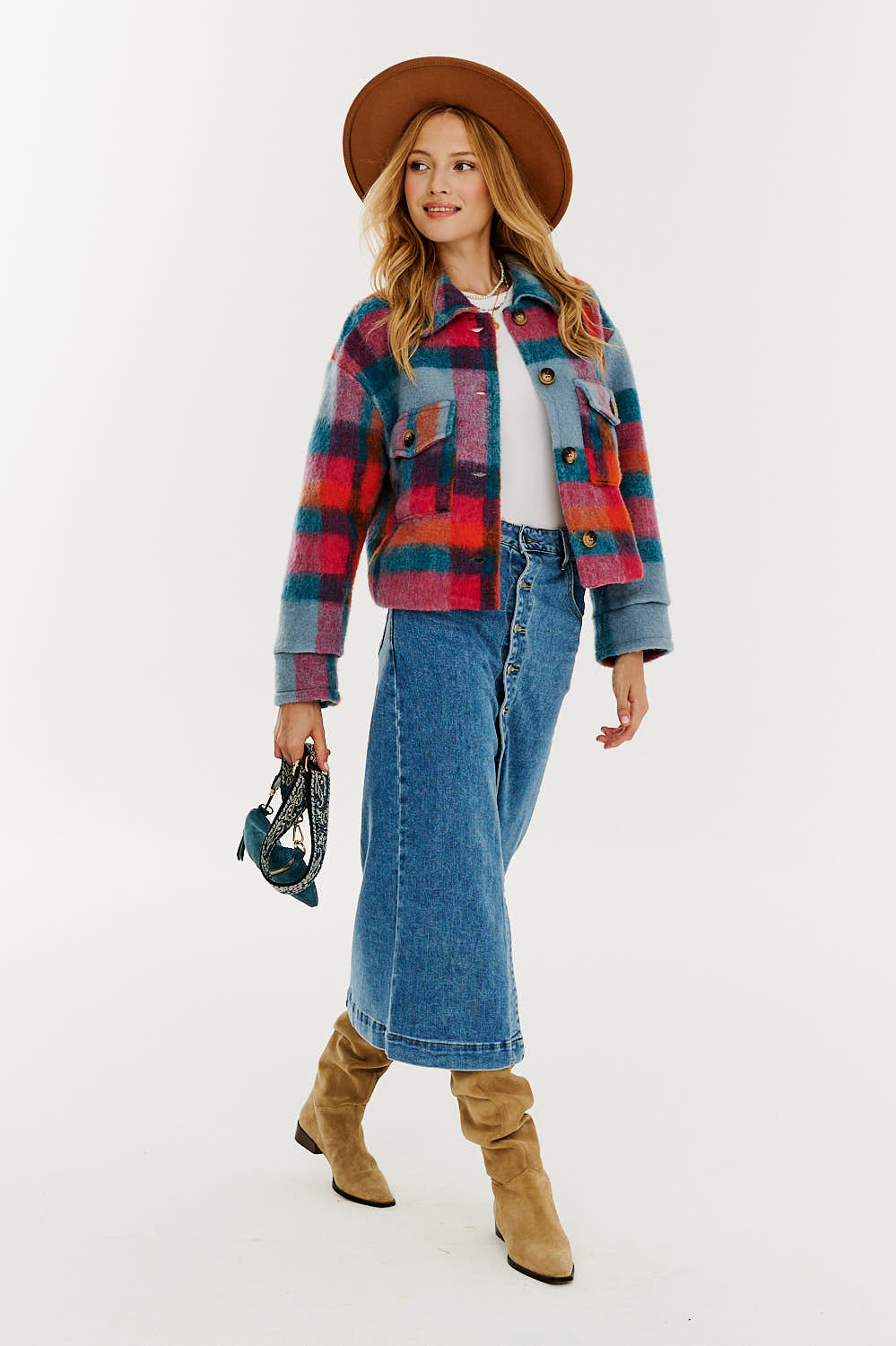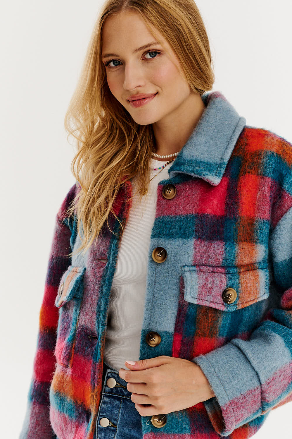 Kurtka koszulowa Forever More stanie się Twoją ulubioną, jesienną propozycji kurtki! Kurtka posiada krótki, kwadratowy krój, dzięki któremu optycznie wysmuklisz swoją sylwetkę. Jest zapinana na guziki. Ma dwie przednie kieszenie z klapkami i guzikami, co dodaje jej praktycznego charakteru.Jej patchworkowy wzór sprawi, że będzie pasować do wielu stylizacji. Idealnie sprawdzi się w chłodniejsze dni, a intensywne kolory nadają jej stylowy i przyciągający uwagę wygląd.