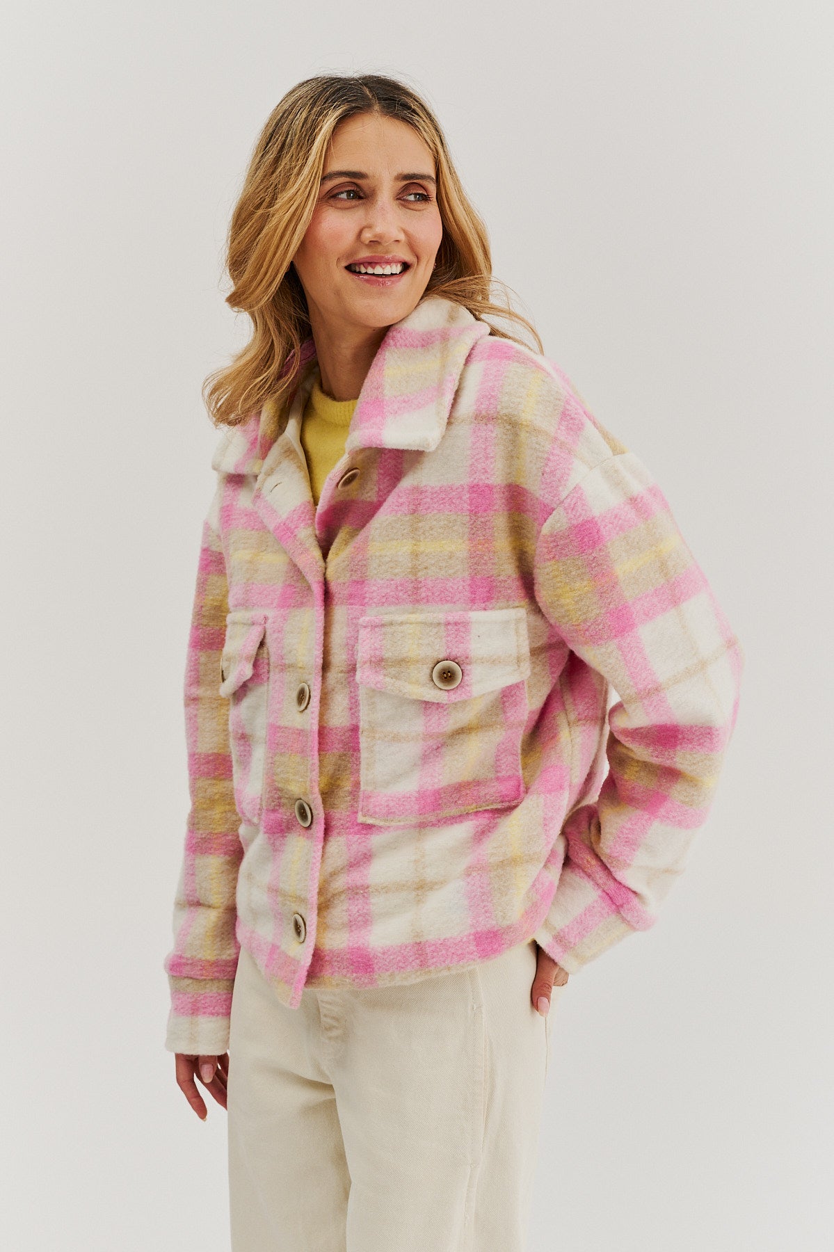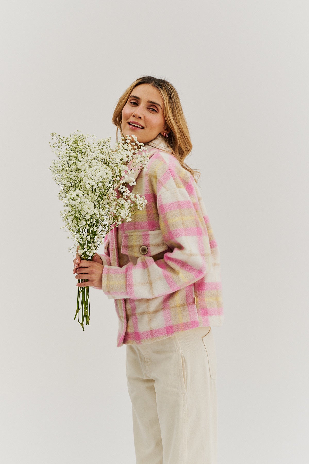 Kurtka koszulowa Fresh Start to propozycja, która doda koloru nawet najbardziej pochmurnym porankom. Jej kraciasty wzór w pastelowych odcieniach beżu i różu to idealne połączenie klasyki i świeżości, które od razu przyciąga spojrzenia. Ciepły, miękki materiał z dodatkiem wełny otuli Cię w chłodniejsze dni, a oversizowy krój zapewni komfort noszenia i swobodę ruchów.
