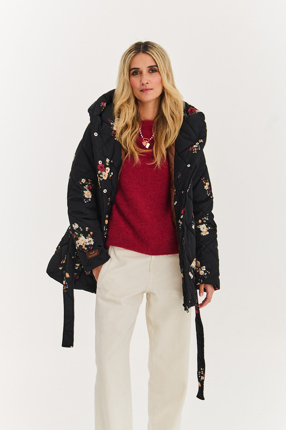 Kurtka Anabelle Midnight Flora to propozycja dla miłośniczek ponadczasowej elegancji z nutą retro. Model o kroju parki z kapturem zachwyca deseniem – delikatnymi kwiatami rozsianymi na głębokiej czerni. Kontrastowa, brązowa podszewka w kapturze dodaje ciepła.