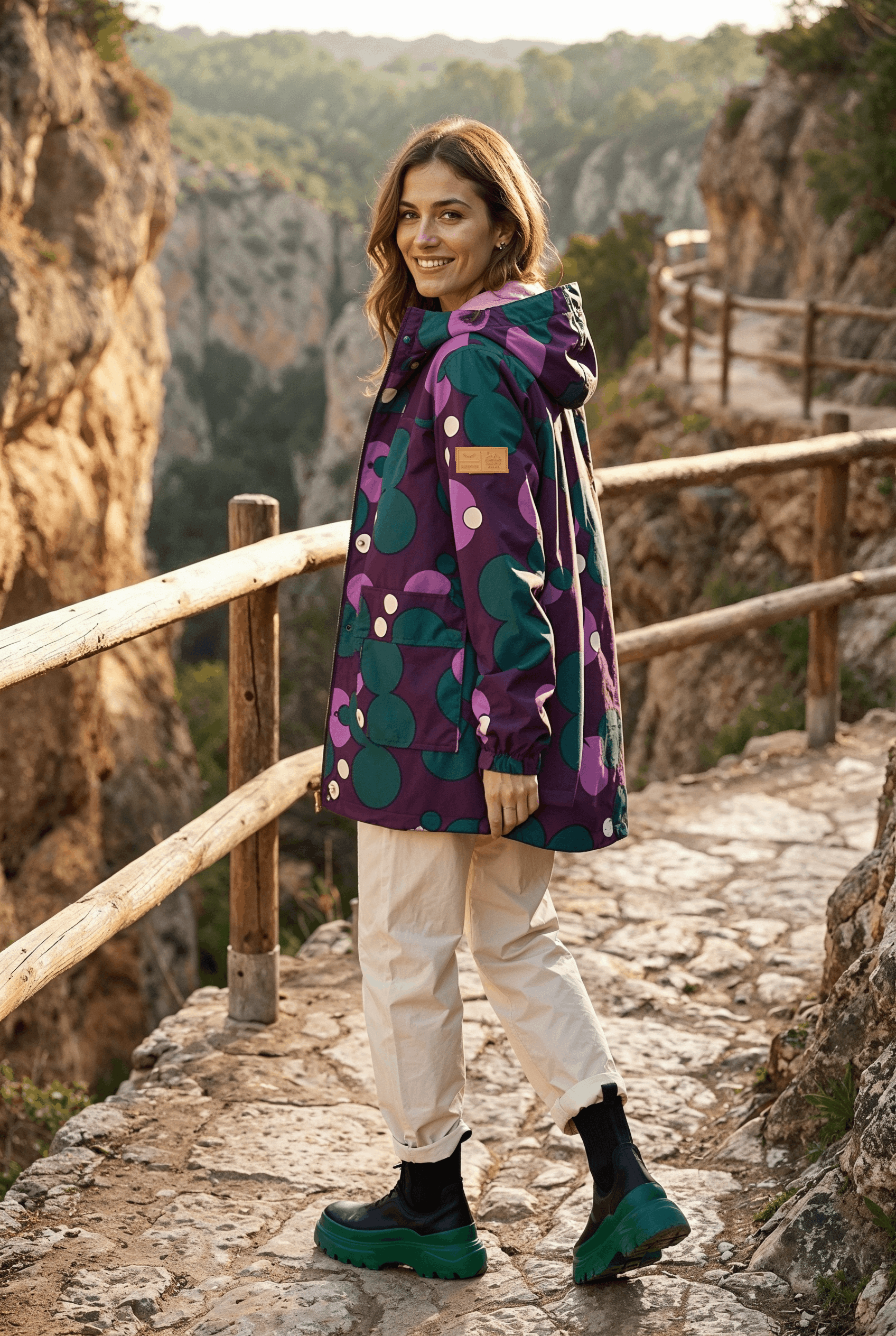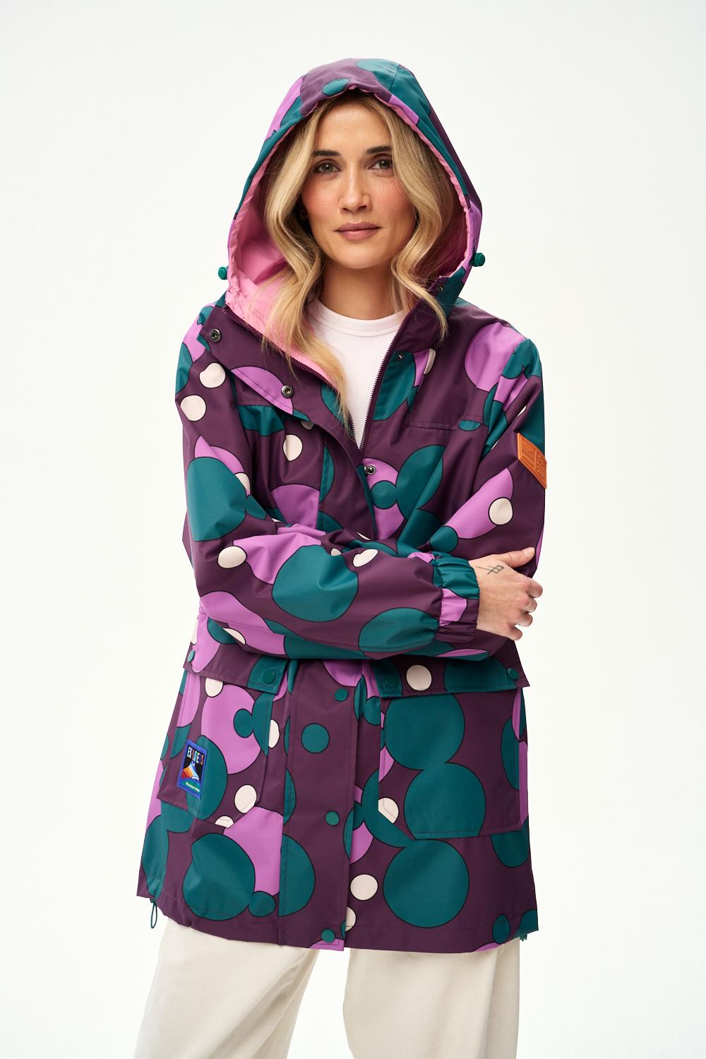 Kurtka przeciwdeszczowa Bubbles łączy głęboki burgund z dużymi, nachodzącymi na siebie kołami w kolorze morskim i różowym. To projekt, który bawi się formą i kolorem, nie tracąc przy tym nic ze swojej funkcjonalności. Luźny krój pozwala na założenie pod spód grubszego swetra lub bluzy.