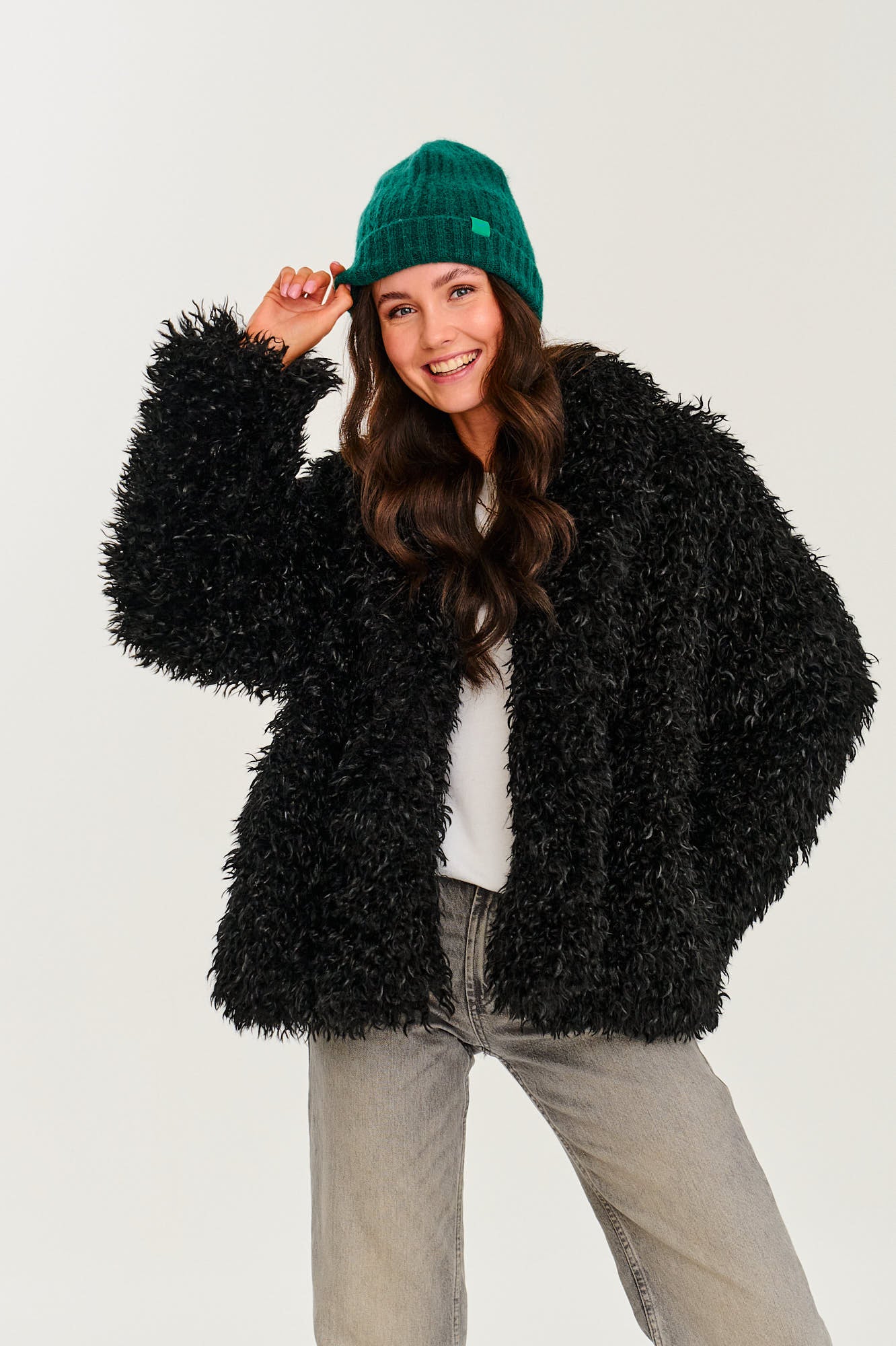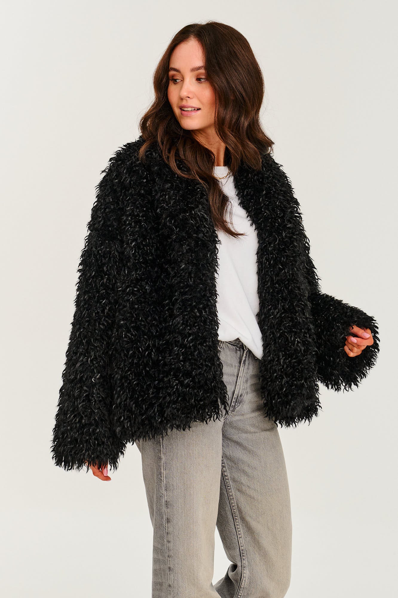 Kurtka ze sztucznego futerka Eclipse to stylowy i przytulny wybór na chłodniejsze dni, idealny dla osób ceniących odważne i unikalne elementy w swojej garderobie. Wykonana z czarnego, sztucznego futrka, kurtka wyróżnia się swoją teksturą i efektownym wyglądem, przyciągając wzrok swoją głębią koloru.