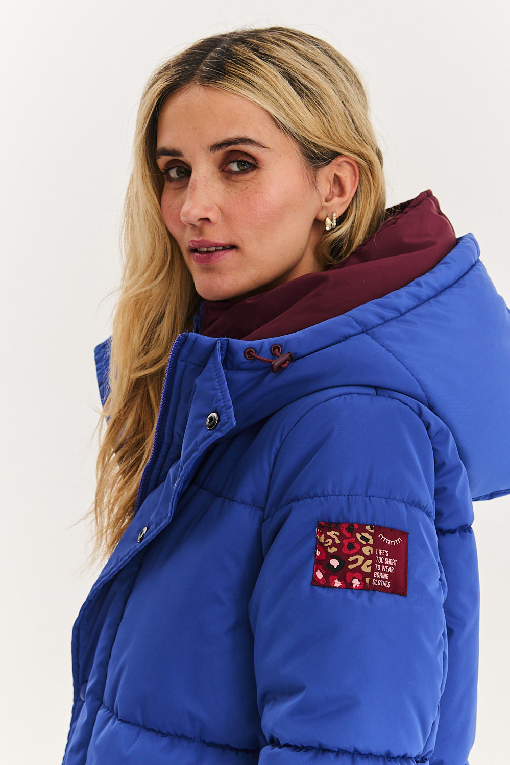Długa kurtka Deep North to Twój niezbędnik na zimowe mrozy. Model łączy w sobie ponadczasowy krój parki z modnymi akcentami. Główny, granatowy kolor płaszcza został pięknie przełamany przez kaptur i wewnętrzną plisę w odcieniu głębokiego bordo.