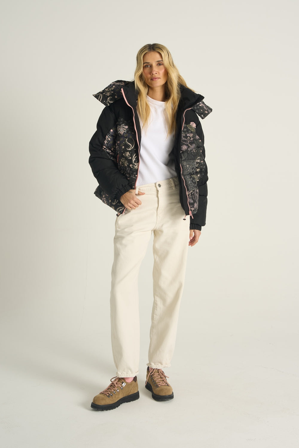 Kurtka zimowa Ember Boheme Garden to połączenie funkcjonalności kurtki puchowej z artystycznym wzorem w stylu bohemy. Ciemna kolorystyka z motywami roślinnymi i paisley tworzy niezwykle stylową i oryginalną całość. To idealna propozycja dla kobiet, które lubią bawić się modą i cenią sobie niebanalne rozwiązania.