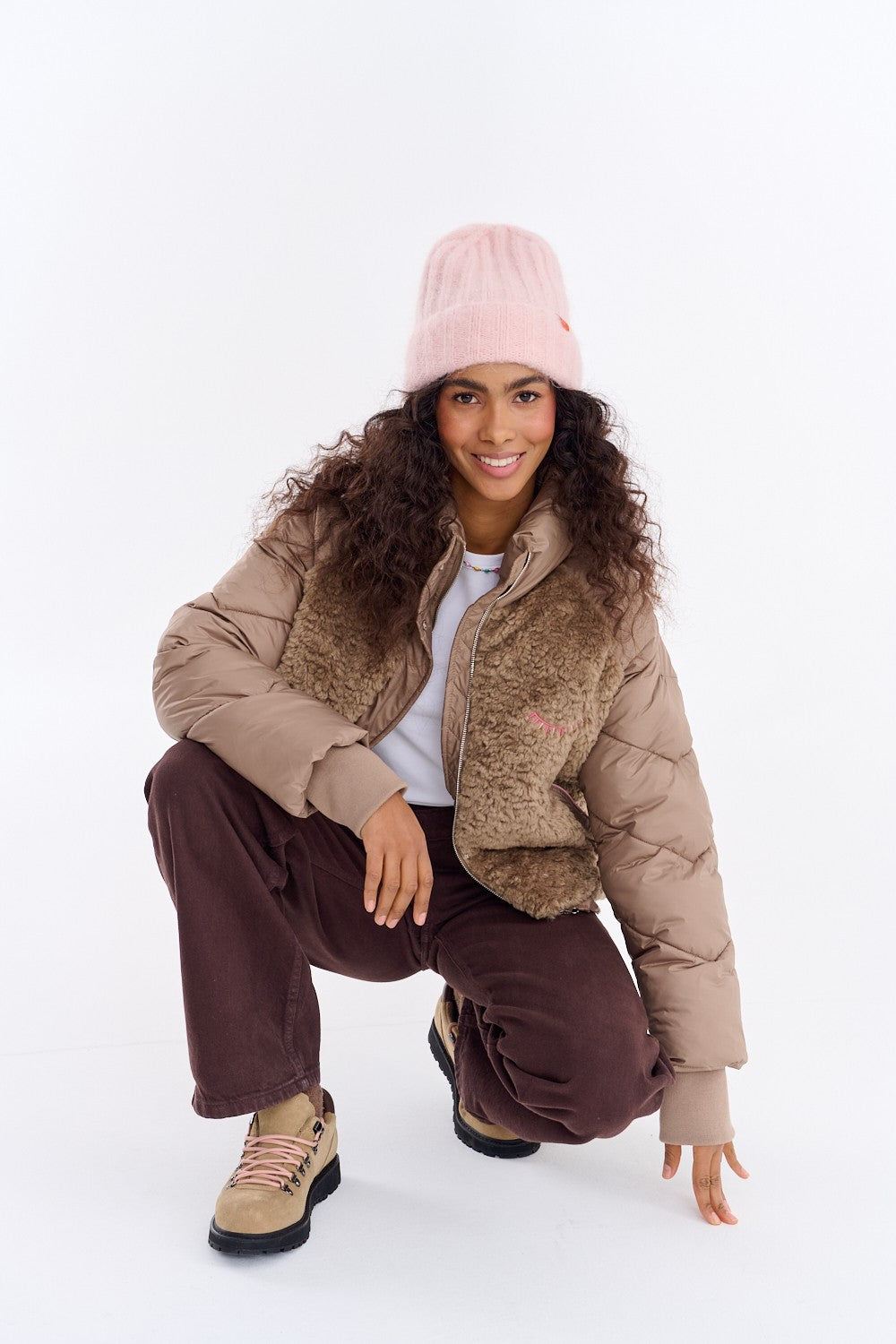 Kurtka zimowa Frosty Sky to model, który przyciąga spojrzenia. Jej unikalny design łączy ciepłą, pikowaną konstrukcję z panelem z miękkiego materiału teddy na przodzie, tworząc niepowtarzalny efekt. Wysoki kołnierz otuli Cię w wietrzne dni, a subtelne, różowe akcenty na kieszeniach dodadzą stylizacji uroku.