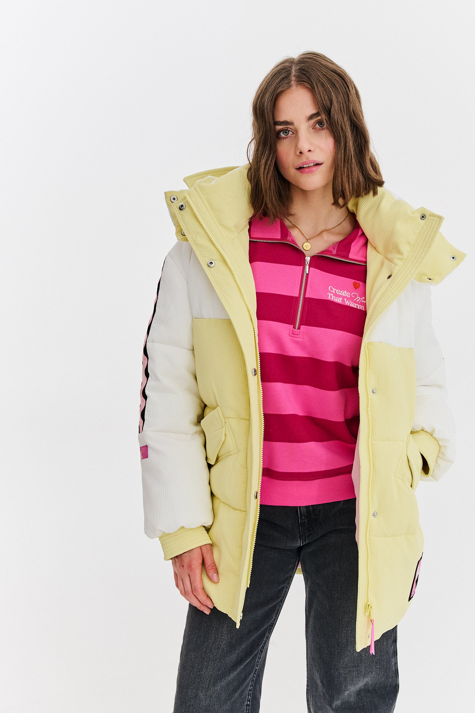 Kurtka zimowa Yuka Frosted Sunshine to urocze i stylowe okrycie na zimę. Jej luźny, wygodny krój zapewnia swobodę ruchów, a ciepłe wypełnienie i kaptur wykończony napami. Ozdobne, kontrastowe taśmy na rękawach dodają jej unikalnego, sportowego charakteru.