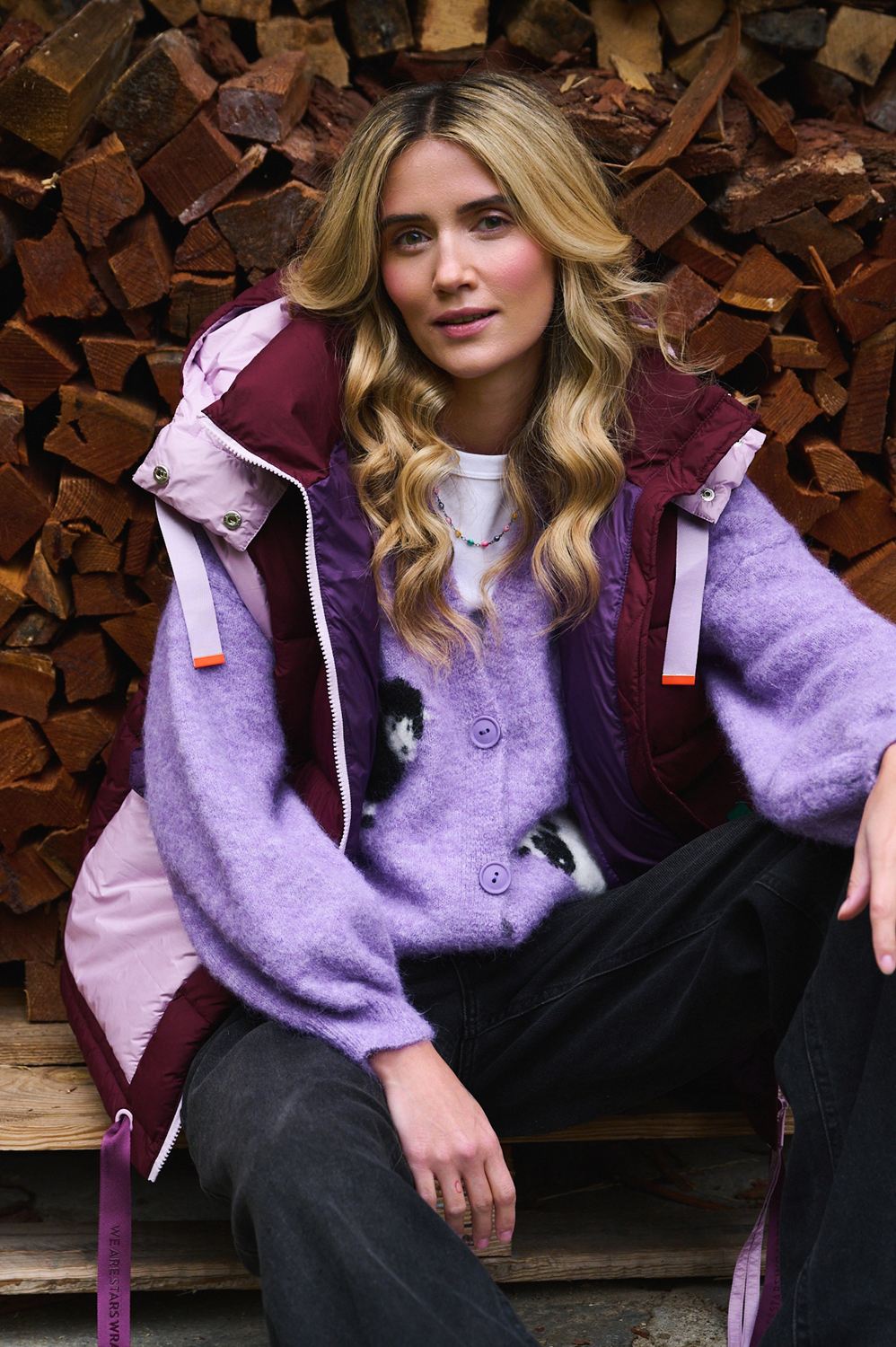 Design kurtki opiera się na modnym color-blockingu, łącząc różne, głębokie odcienie: bordo, fiolet i akcenty różu. Duże, naszywane kieszenie są nie tylko praktyczne, ale też stanowią ciekawy element dekoracyjny. Sznurki na dole pozwalają na dopasowanie kurtki do sylwetki i dodatkową ochronę przed chłodem.