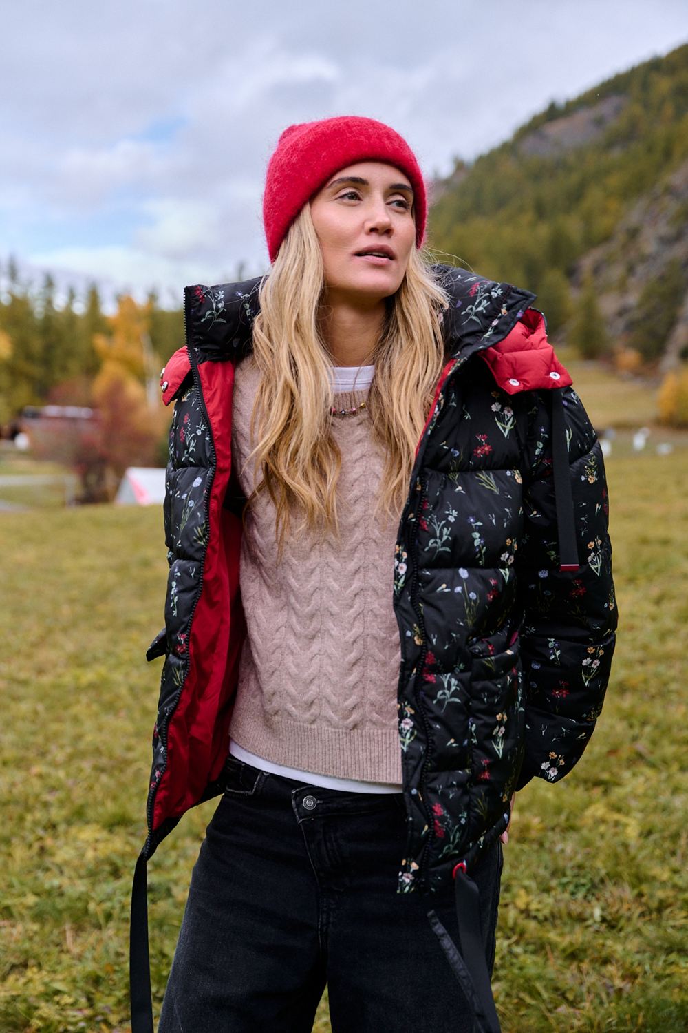 Ciemne tło kurtki pięknie eksponuje drobny, kolorowy wzór w polne kwiaty, nadając jej romantycznego, a zarazem tajemniczego charakteru. Funkcjonalne detale, jak regulowany kaptur, ściągacz na dole i kieszenie, sprawiają, że jest to wybór nie tylko piękny, ale i praktyczny na jesienno-zimowy sezon.