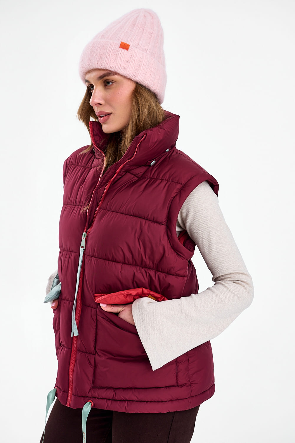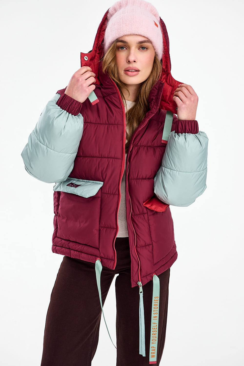 Kurtka zimowa z odpinanymi rękawami Vinterra to propozycja dla kobiet, które lubią nieoczywiste i stylowe połączenia kolorystyczne. Głęboki, winny odcień bordo na korpusie idealnie współgra z pastelową, miętową zielenią rękawów oraz energetycznymi, czerwonymi akcentami przy kapturze i kieszeniach.