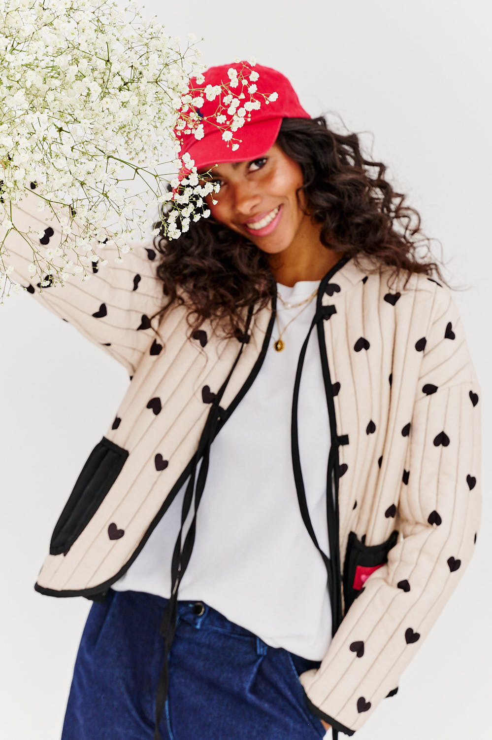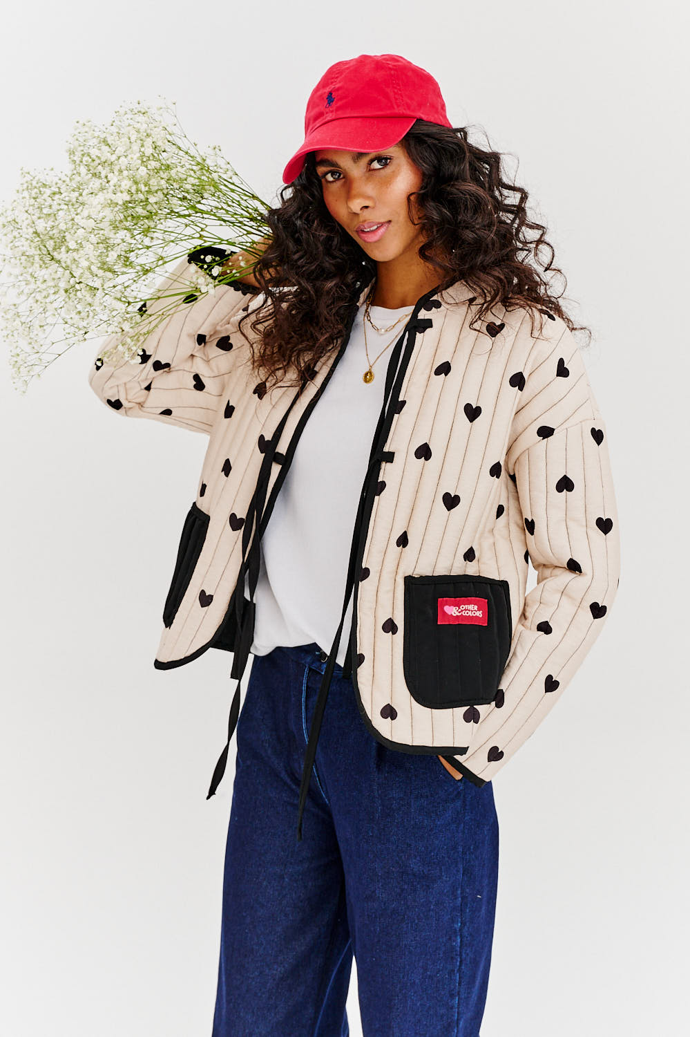 Lekka kurtka pikowana Bound by Love to połączenie romantycznego wzoru i minimalistycznego designu. Delikatne pikowanie dodaje jej subtelnej struktury, a czarne serca na jasnym tle tworzą wyrazisty, ale jednocześnie elegancki look. Kontrastowe kieszenie i wiązanie z przodu nadają jej oryginalny charakter, podkreślając nonszalancki styl.