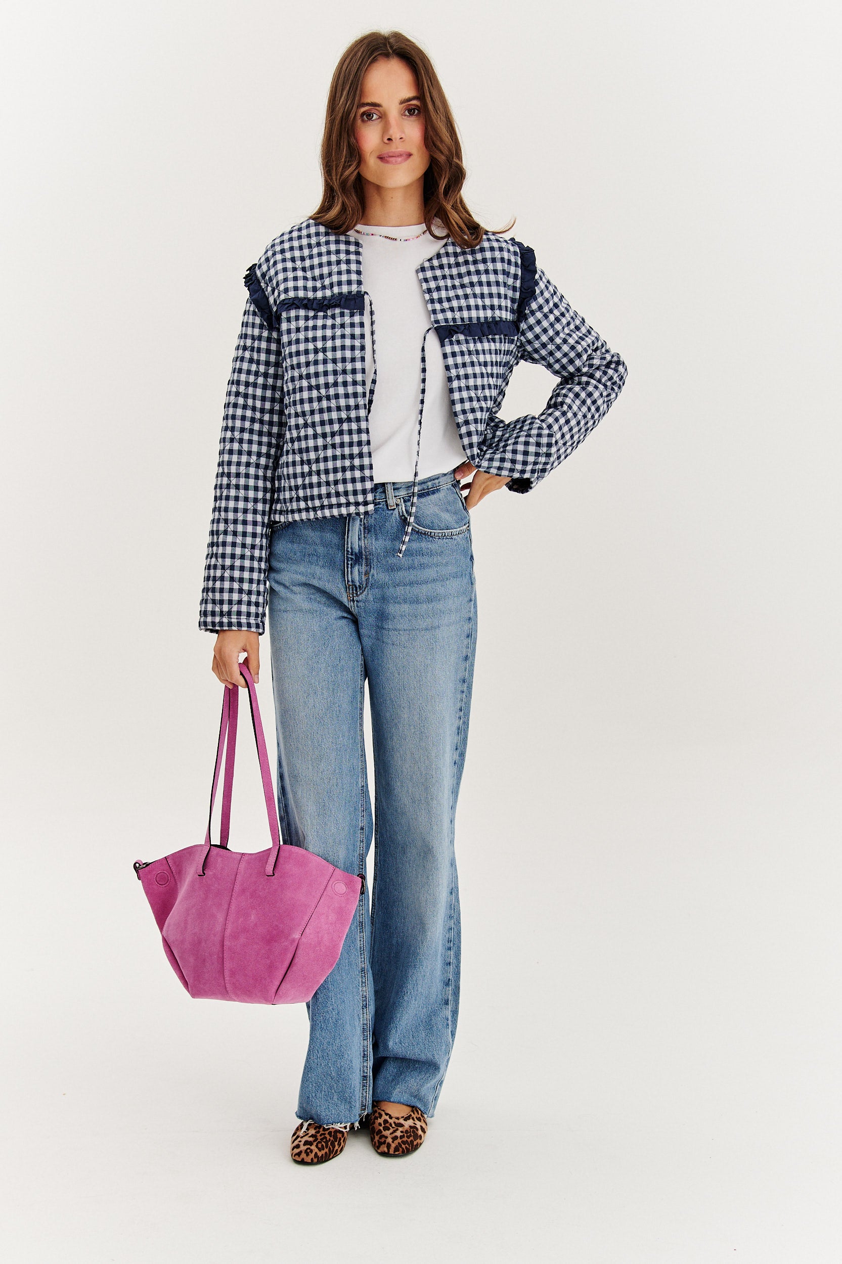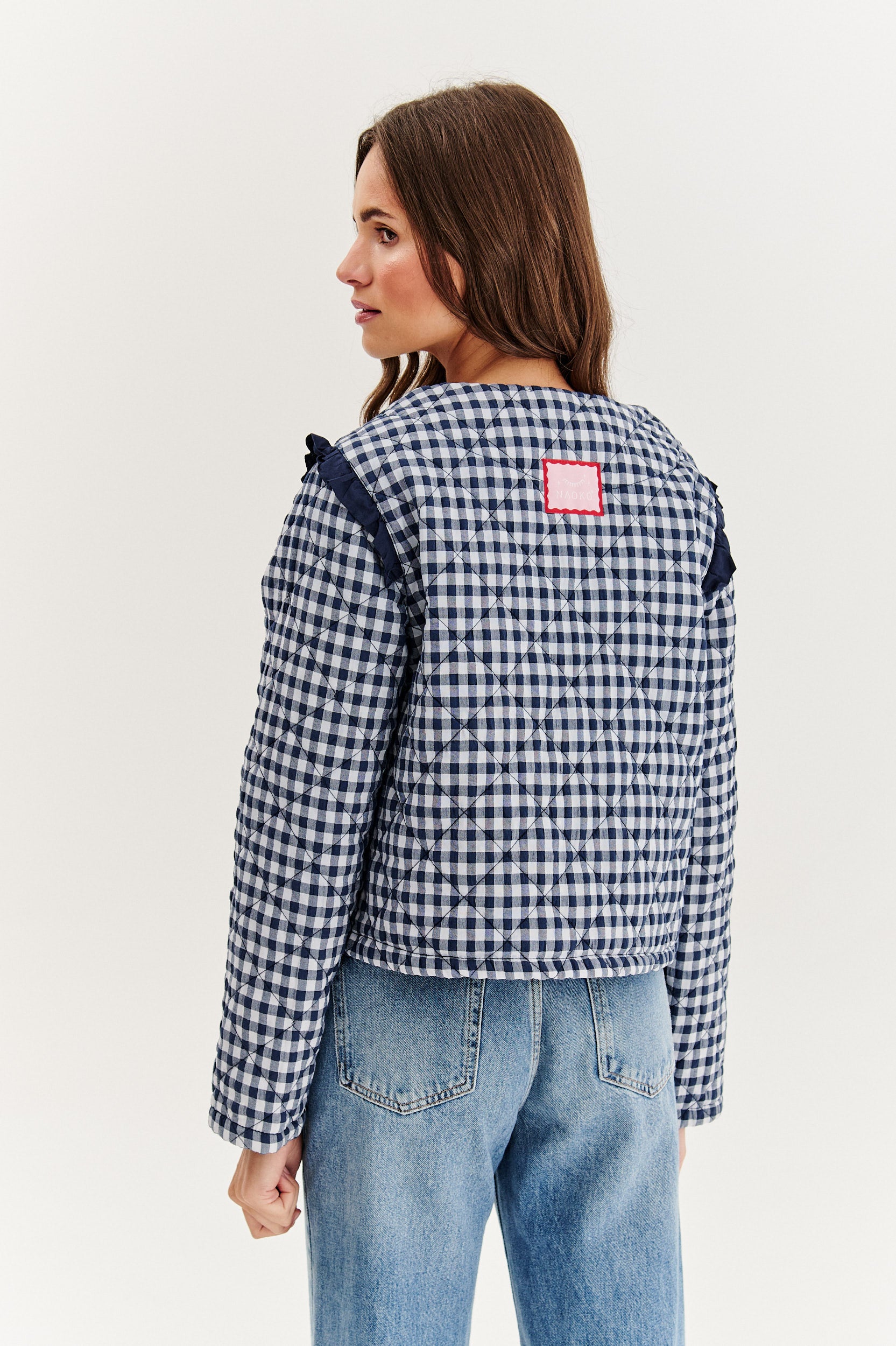 Jeśli jesteś fanką nieoczywistych detali i lubisz wyróżniać się z tłumu – lekka kurtka pikowana Indigo Charm powstała właśnie dla Ciebie. Ten model zachwyca kratką, wykończoną falbanką i troczkiem w jednolitym granacie, które dodają całości uroku inspirowanego estetyką vintage. To idealna kurtka na sezon przejściowy – lekka, miękka, ale z charakterem.