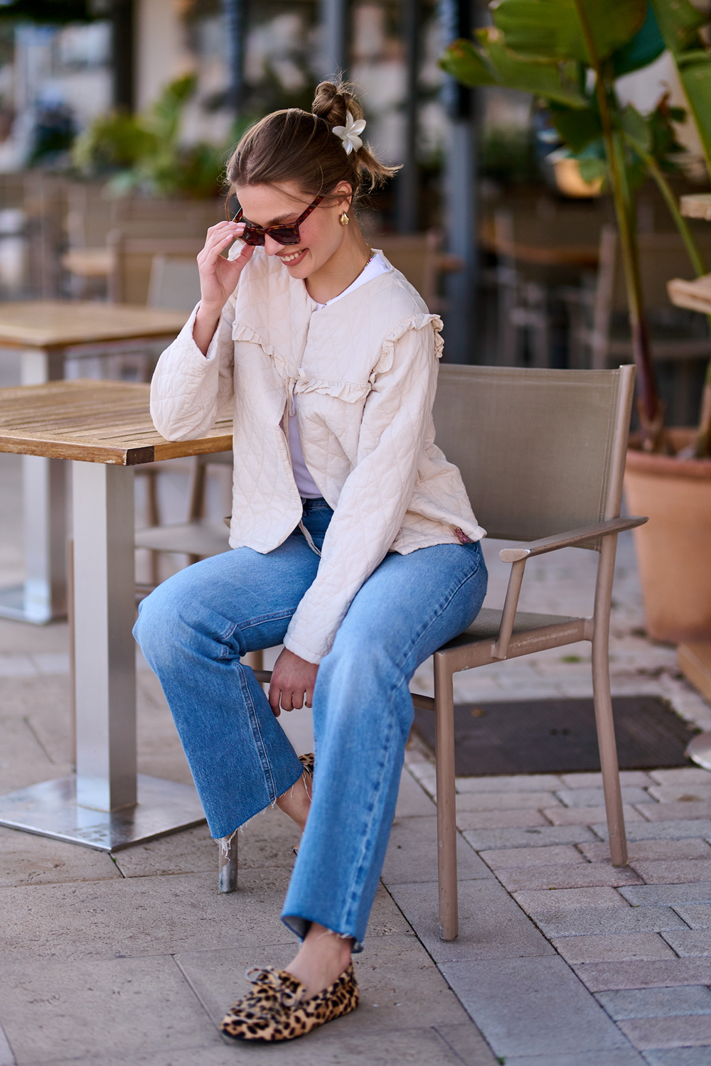 Pikowany materiał tworzy przytulny efekt, a romantyczne detale, takie jak delikatne marszczenie i wiązanie, dodają całości dziewczęcego uroku. To kurtka, którą możesz narzucić na sukienkę lub połączyć z jeansami – i zawsze wyglądać świetnie.