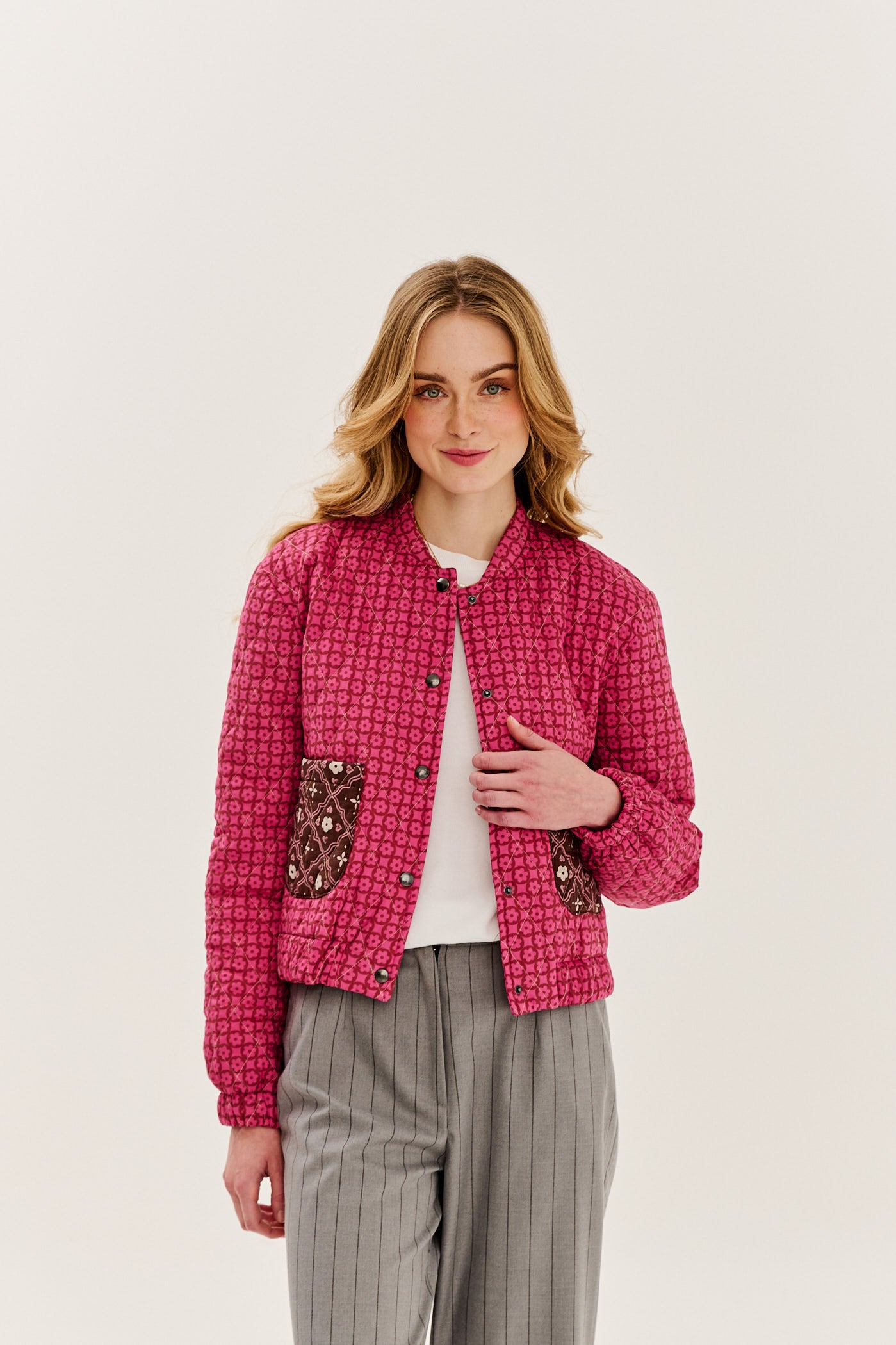 Styl vintage w nowoczesnym wydaniu! Lekka kurtka pikowana Retro Spring zachwyca unikalnym wzorem i dopracowanymi detalami. Jej krój bomberki zapewnia wygodę i swobodę ruchów, a zapinanie na napy dodaje jej funkcjonalności. Design w odcieniach ciepłego różu z kontrastowymi, wzorzystymi kieszeniami inspirowanymi stylem retro sprawia, że kurtka jest nie tylko praktyczna, ale i pełna charakteru.