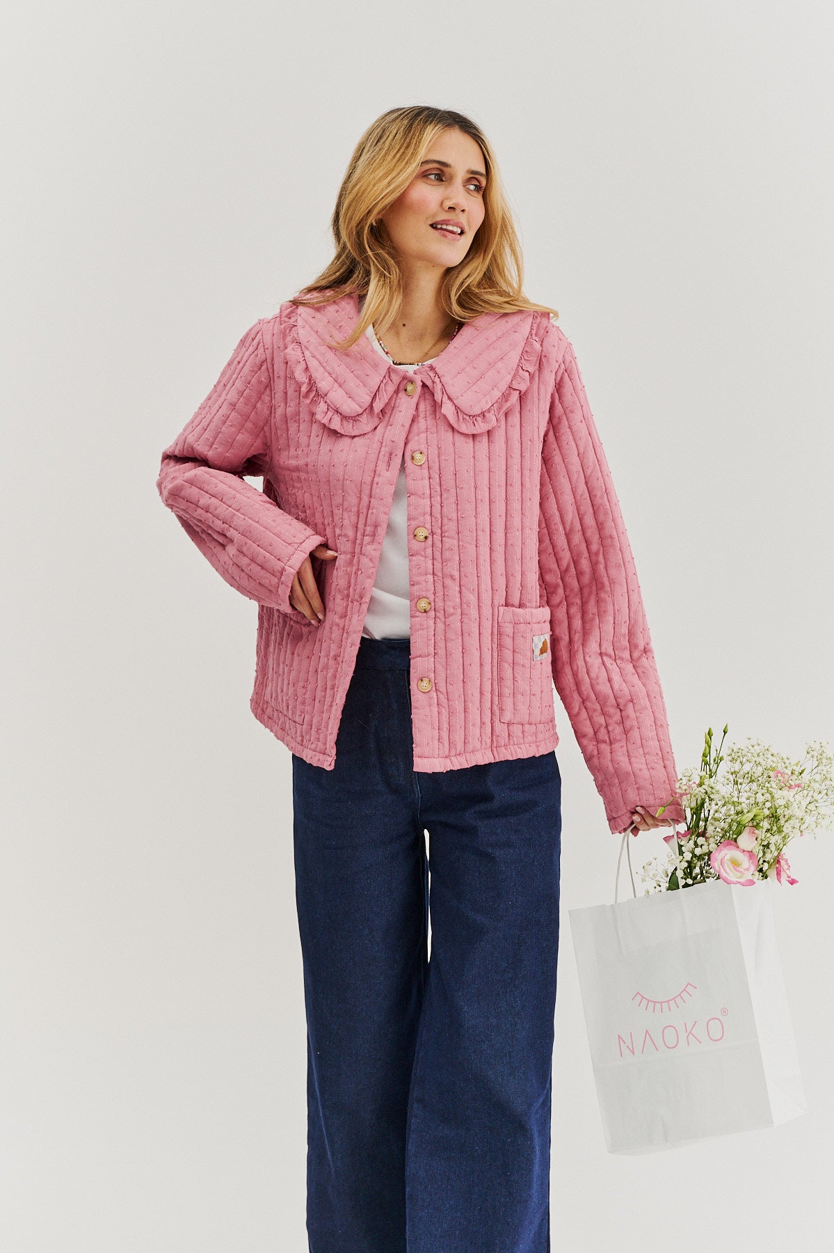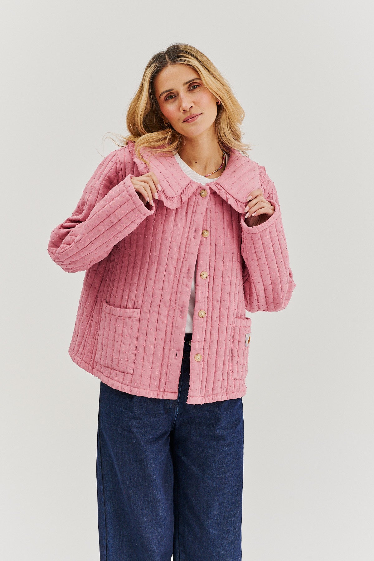 Lekka kurtka pikowana Rosy Blush to wyjątkowe połączenie romantycznej estetyki i subtelnej elegancji. Delikatny odcień różu, struktura i ozdobny kołnierzyk z falbanką nadają jej dziewczęcego uroku. Luźny krój zapewnia komfort noszenia, a praktyczne kieszenie dodają funkcjonalności.