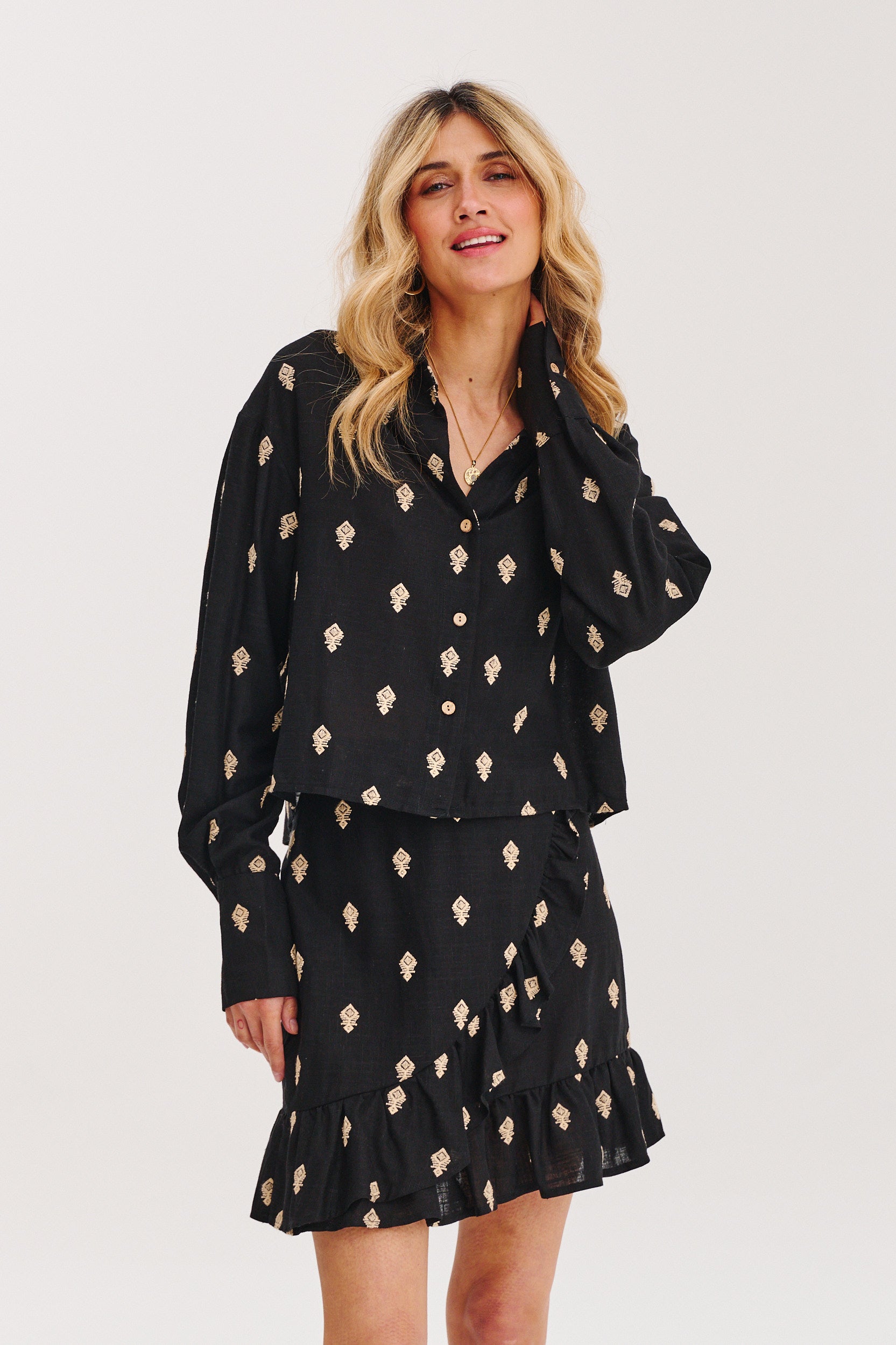 Lniana spódniczka mini Moon Jane to boho klasyka z nutą romantycznej nonszalancji. Czarny odcień przełamany haftowanymi motywami i falbaną u dołu sprawia, że ten model przyciąga wzrok, nie tracąc przy tym lekkości. Jej kopertowy krój i naturalny materiał z dodatkiem lnu, zapewniają wygodę i swobodę ruchu — idealną na wakacyjne spacery, festiwale czy letnie randki pod gołym niebem.
