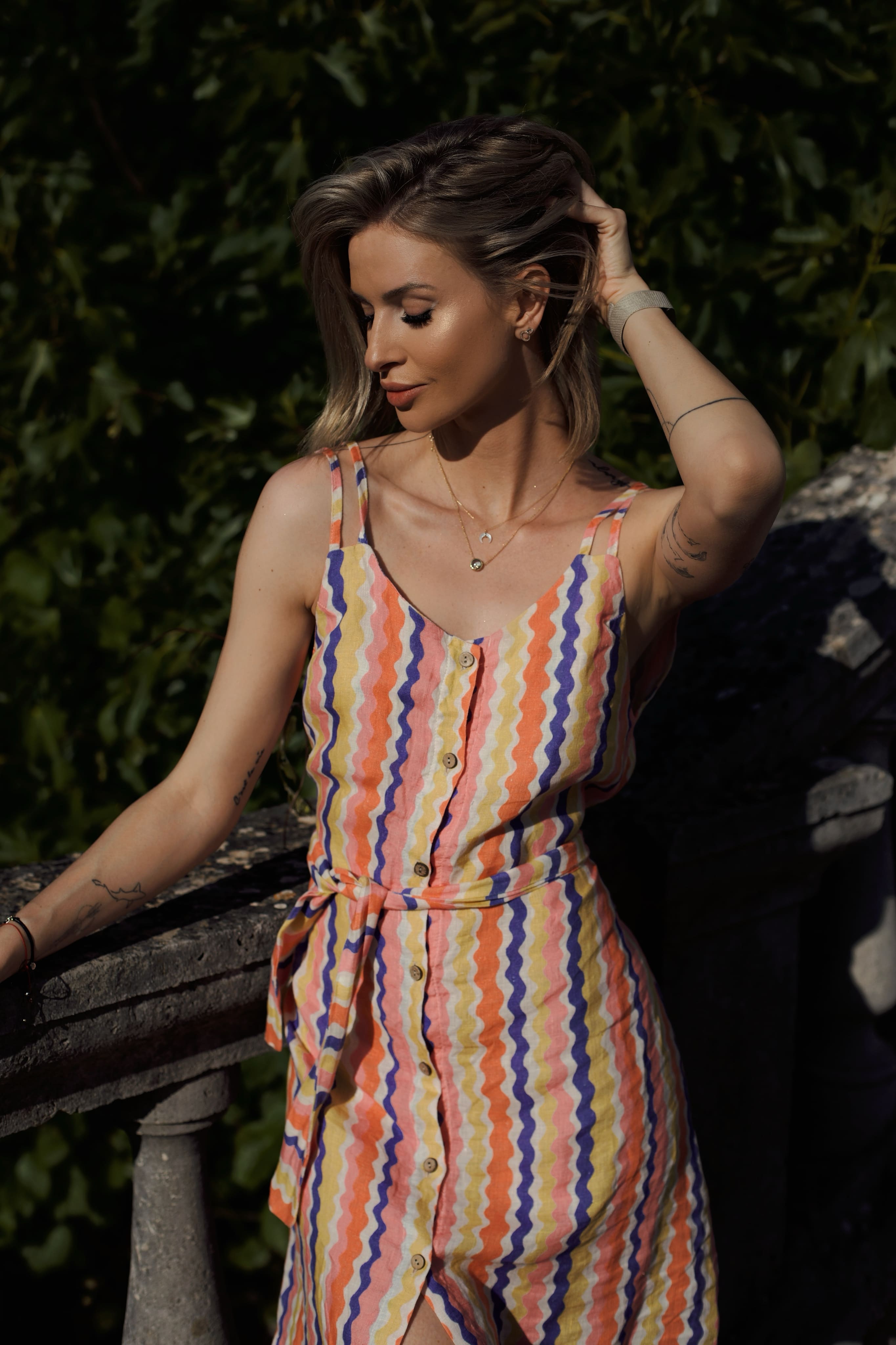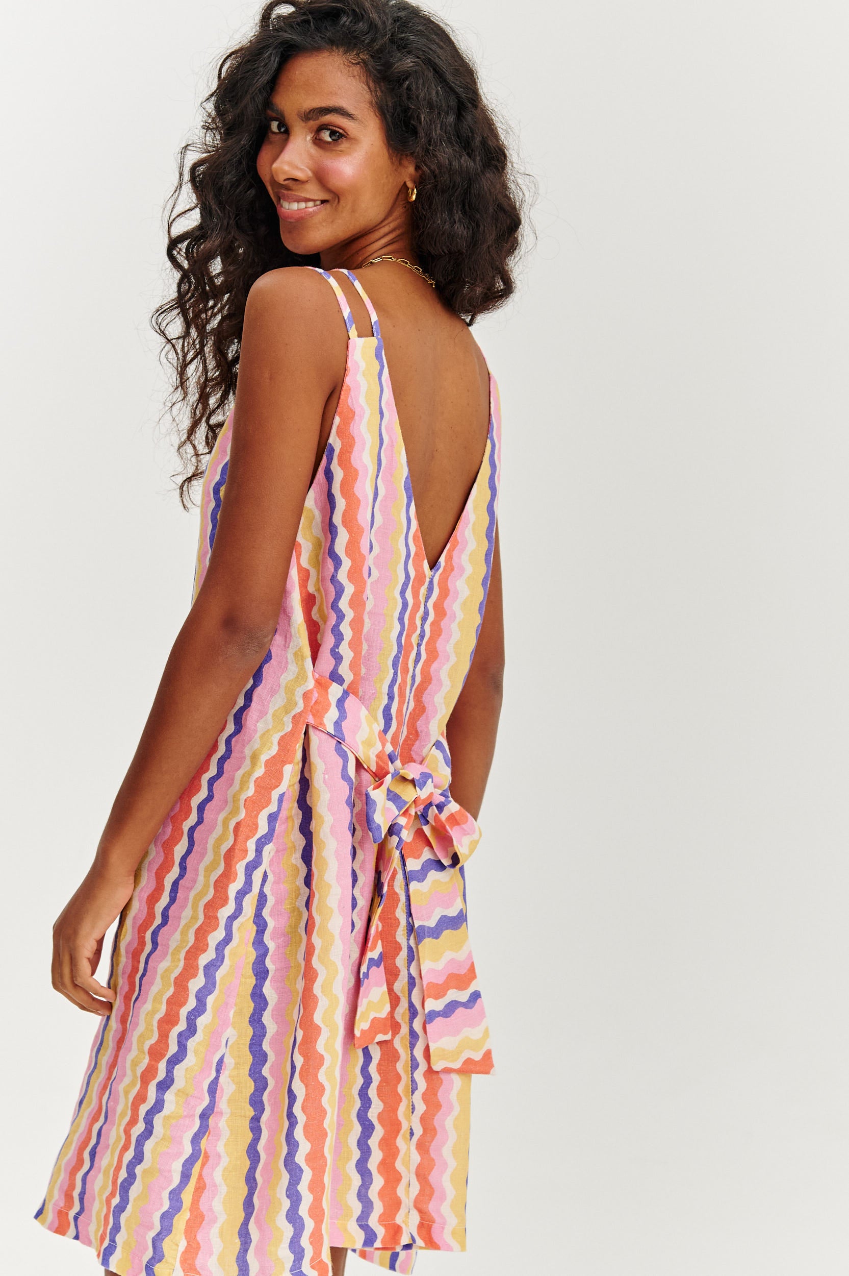 Lniana sukienka mini Tutti Frutti to eksplozja letniego koloru i pozytywnej energii. Jej radosny wzór w nieregularne, kolorowe fale i zmysłowy dekolt na plecach tworzą duet idealny na słoneczne dni. Wiązanie w talii podkreśla sylwetkę, a delikatny len zapewnia komfort noszenia nawet w największe upały.