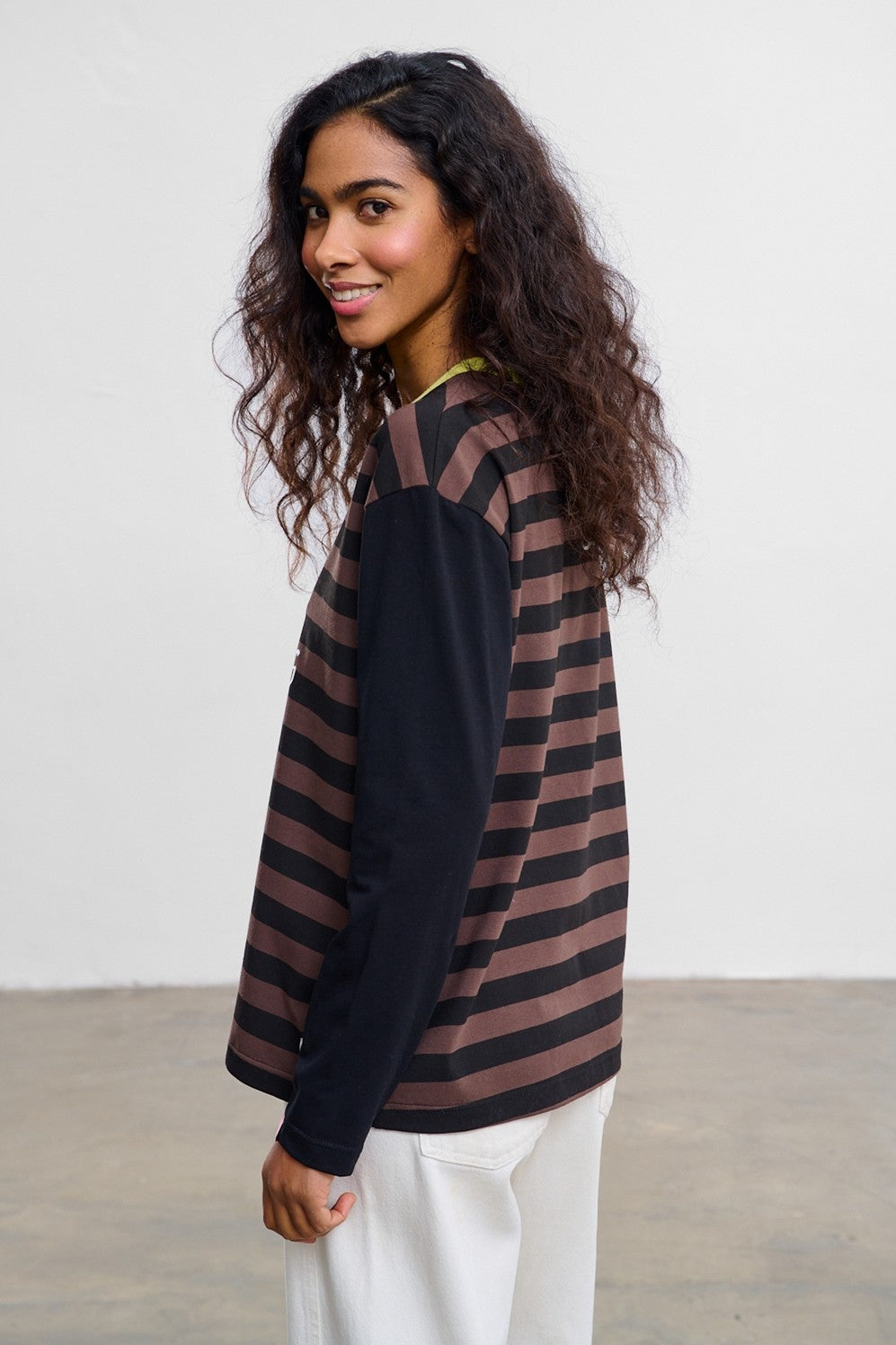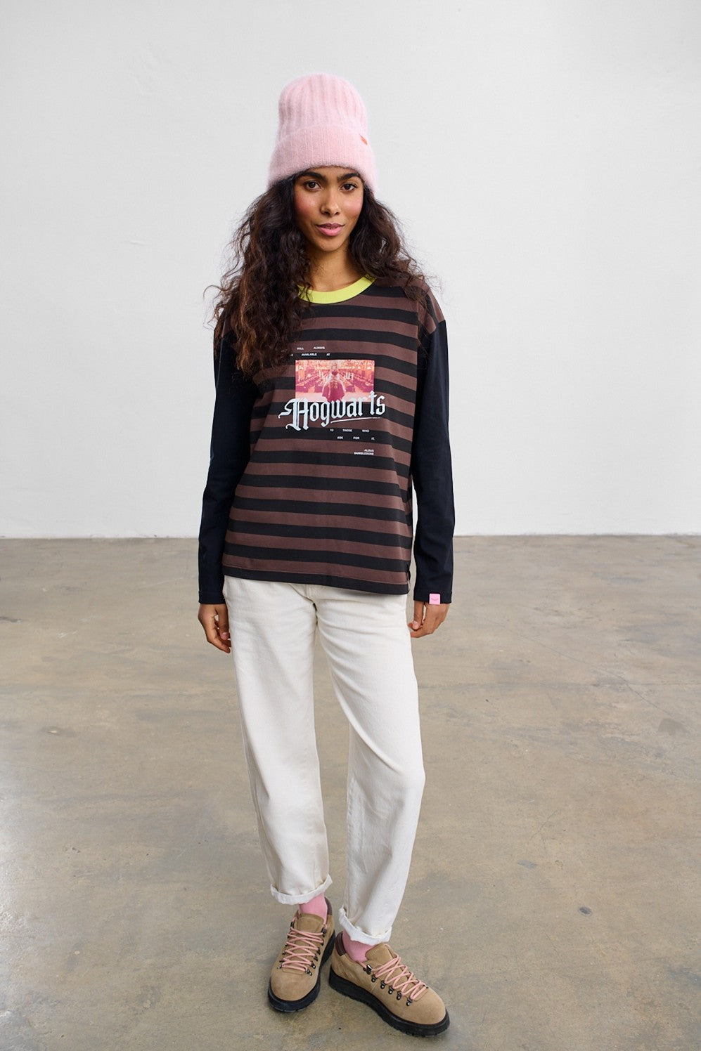 Longsleeve Hogwarts to propozycja dla tych, którzy wciąż czekają na swój list z Hogwartu, ale nie chcą rezygnować z dobrego stylu. Ciemne, poprzeczne pasy nadają bluzce charakteru grunge, a kontrastowe, limonkowe wykończenie dekoltu dodaje jej nowoczesnego twistu. Centralnym punktem jest gotycki napis oraz klimatyczna grafika nawiązująca do sagi o Harrym Potterze.