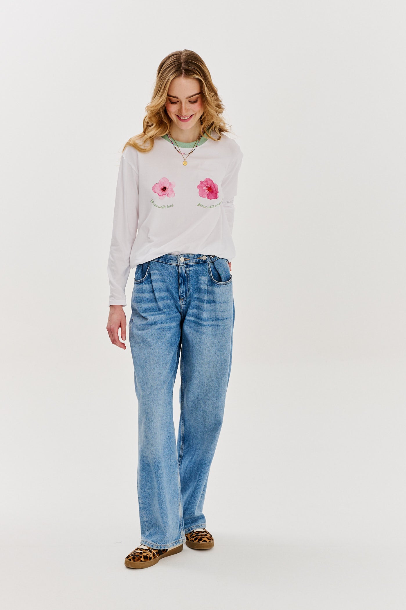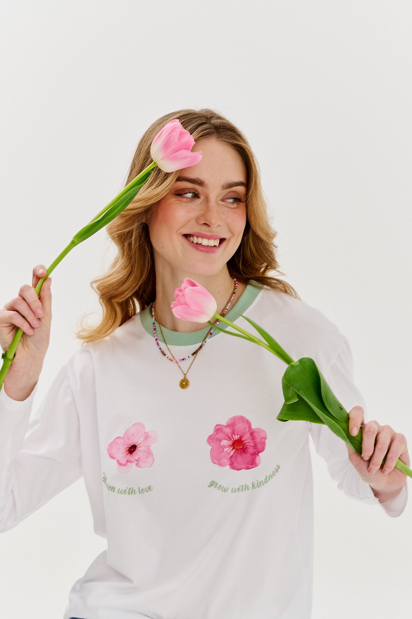 Longsleeve Kindly Bloom to kwintesencja subtelności i kobiecego wdzięku, inspirowana naturą i pozytywną energią. Delikatny kwiatowy print w pastelowych odcieniach symbolizuje czułość, a haftowane przesłanie "Bloom with love, grow with kindness" przypomina o sile tkwiącej w delikatności. Miękki, bawełniany materiał otula komfortem, a oliwkowe wykończenie dekoltu dodaje subtelnego, naturalnego akcentu.