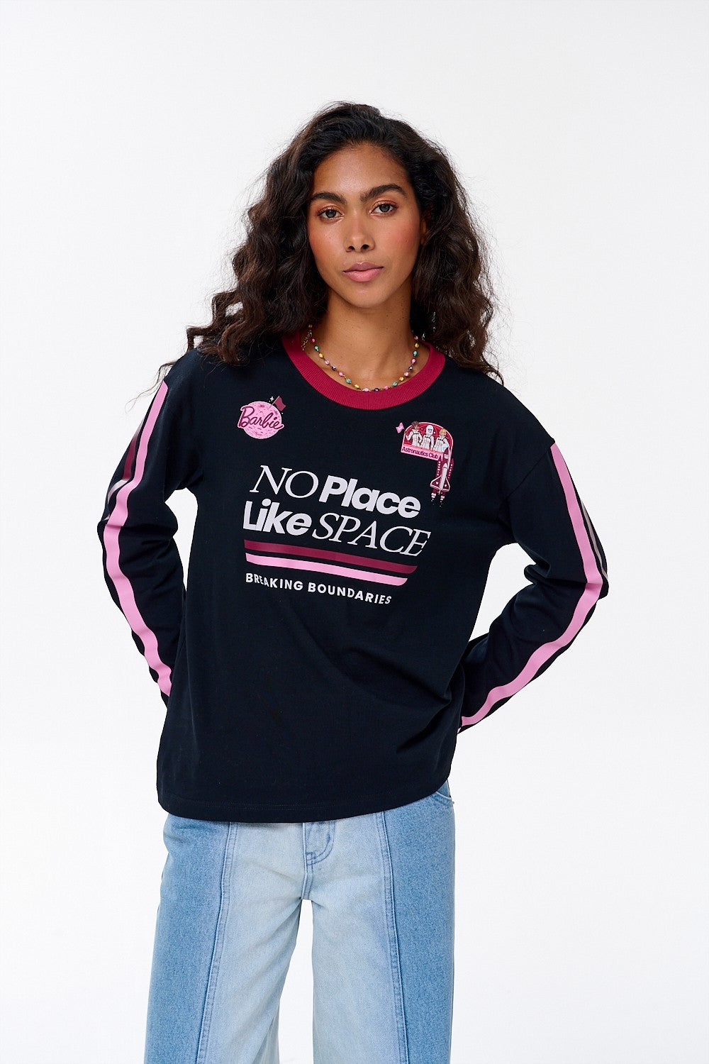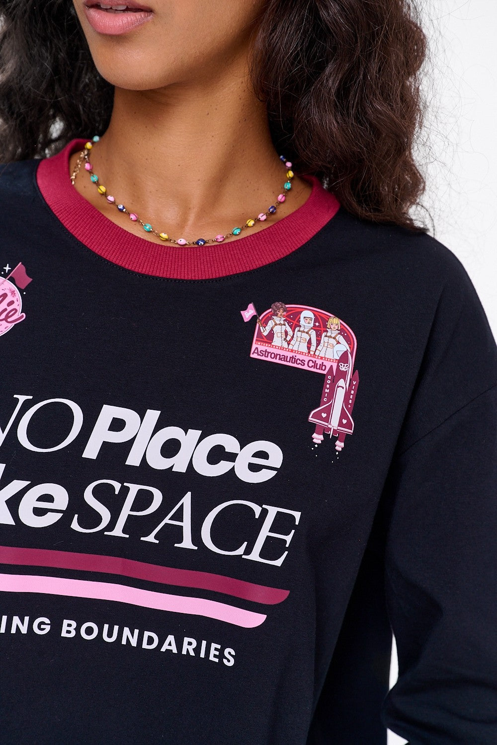 Longsleeve No Place Like Space to idealna propozycja do stylizacji w stylu streetwear. Koszulka w ciemnym kolorze stanowi świetne tło dla wyrazistych detali: różowych pasów biegnących wzdłuż rękawów i dużej grafiki inspirowanej podróżami kosmicznymi.
