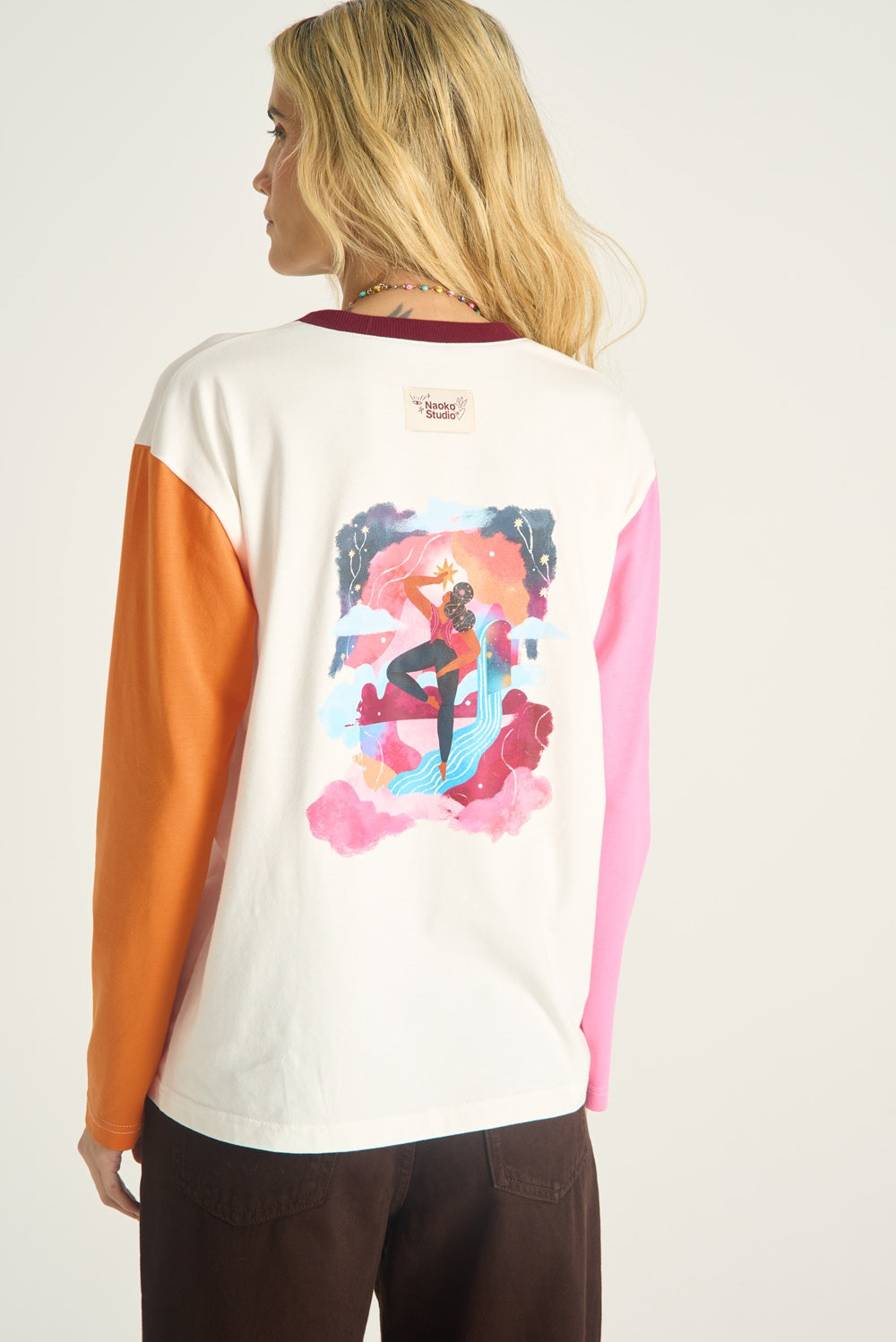 Longsleeve Painted Love to ubranie, które jest manifestem czułości i siły. Stworzony przez cenioną ilustratorkę Loveis Wise w ramach projektu Naoko x Artist Remix, łączy w sobie radość koloru z głębokim przesłaniem. Klasyczny krój został ożywiony asymetrycznymi rękawami w odcieniach pudrowego różu i ciepłego pomarańczu.