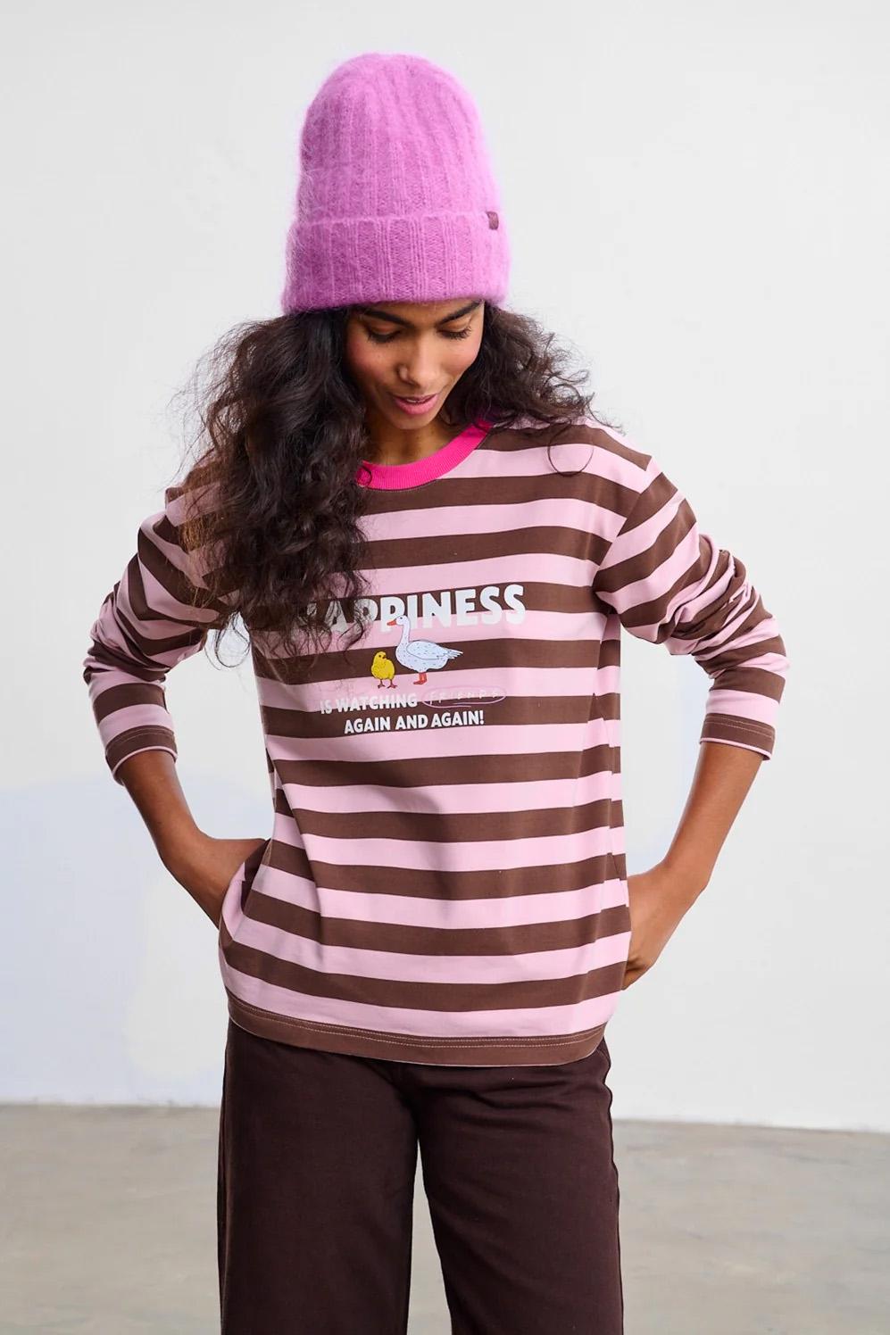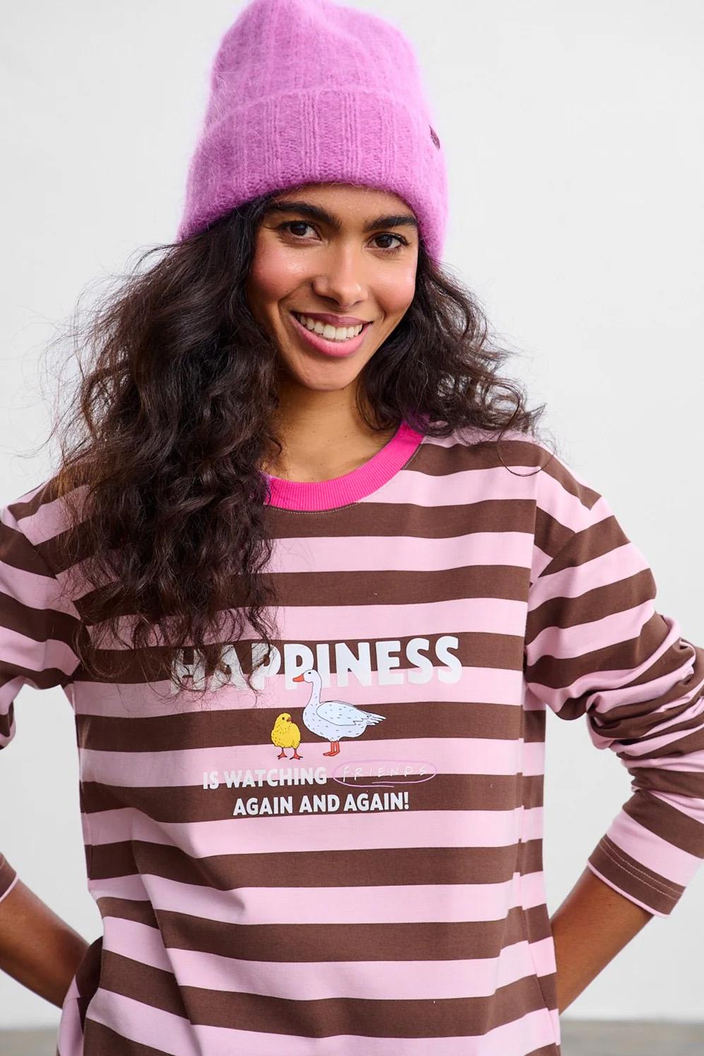Longsleeve Watching Friends to propozycja dla tych, którzy kochają klasykę z przymrużeniem oka. Brązowo-szare pasy i fioletowy ściągacz przy szyi tworzą bazę dla nostalgicznych grafik. Na przodzie znajduje się napis definiujący szczęście jako oglądanie "Friends".