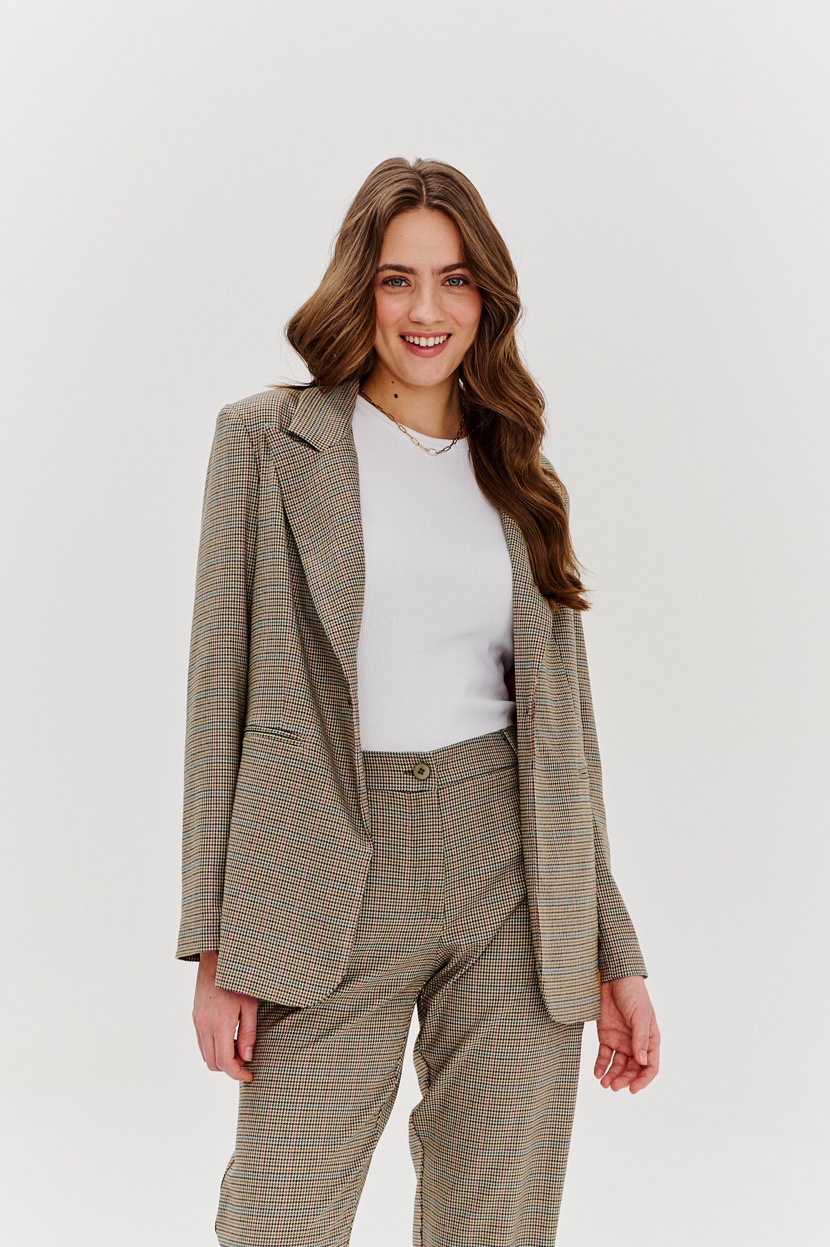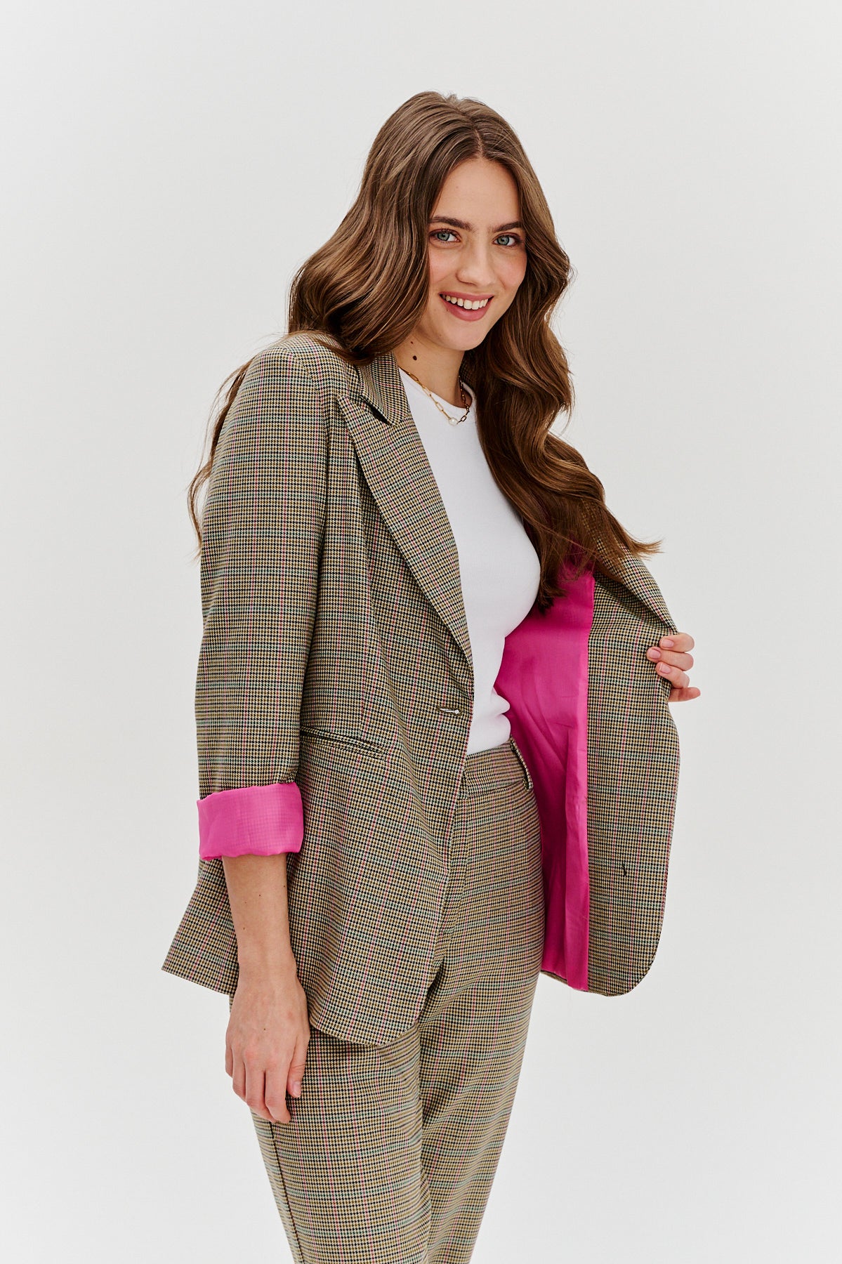 Marynarka Chasing Dreams to klasyczna marynarka w kratę, która łączy ponadczasową elegancję z nowoczesnym twistem. Dopasowany fason z subtelnie zaznaczoną talią podkreśla sylwetkę, a delikatnie wydłużony krój dodaje szyku i pewności siebie. Wykonana z tkaniny w odcieniach beżu i brązu, z kontrastową różową podszewką, która dodaje jej nieoczywistego charakteru.