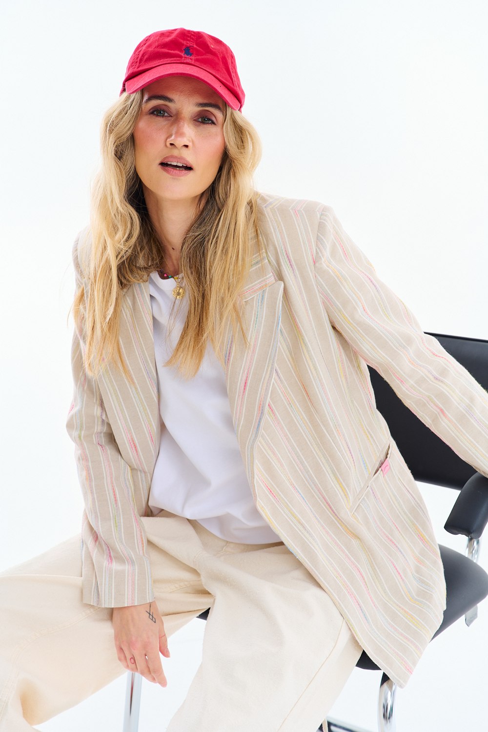 Beżowa baza z dyskretnymi, wielobarwnymi paskami przywodzi na myśl kolory pustynnego świtu. Naturalna tkanina i lniany skład sprawiają, że to idealny wybór na letnie dni – wygodny, oddychający, a jednocześnie elegancki. Noś ją solo, z szortami lub narzuć na sukienkę – zawsze będzie wyglądać wyjątkowo.