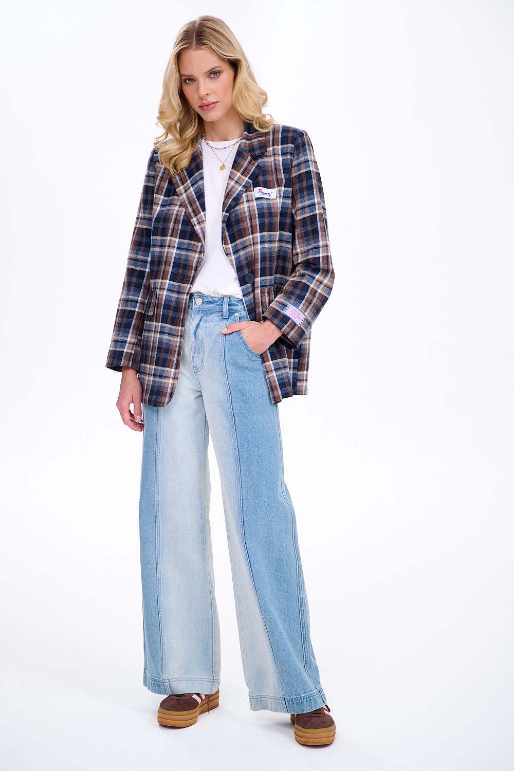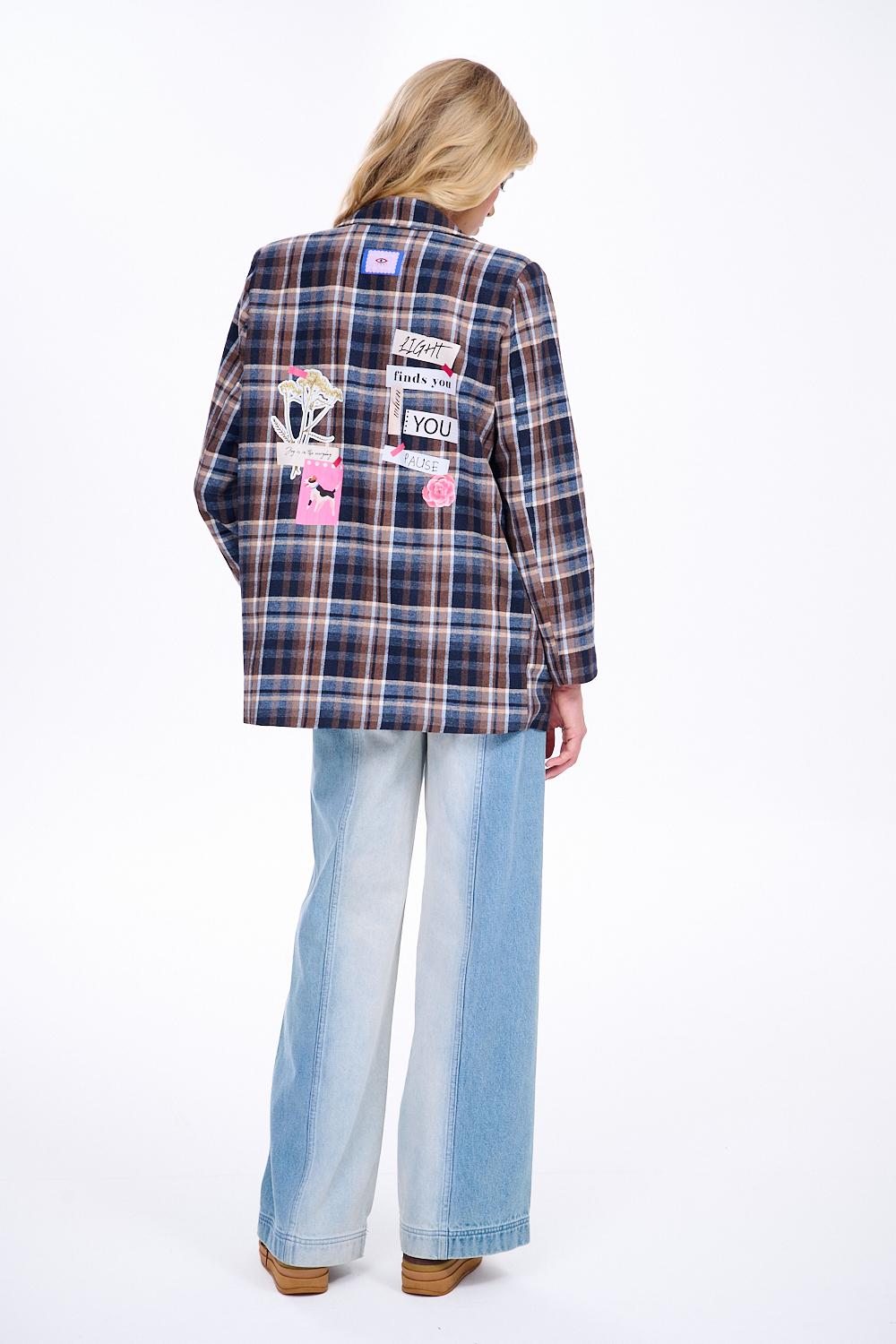 Marynarka Happiness to idealny balans między klasyką a nowoczesnym luzem. Wykonana z miękkiej flaneli, zapewnia komfort noszenia. Z przodu prezentuje się jak klasyczny żakiet w kratę, ale jej tył zdobią oryginalne, kolorowe naszywki, które dodają jej unikalnego charakteru.