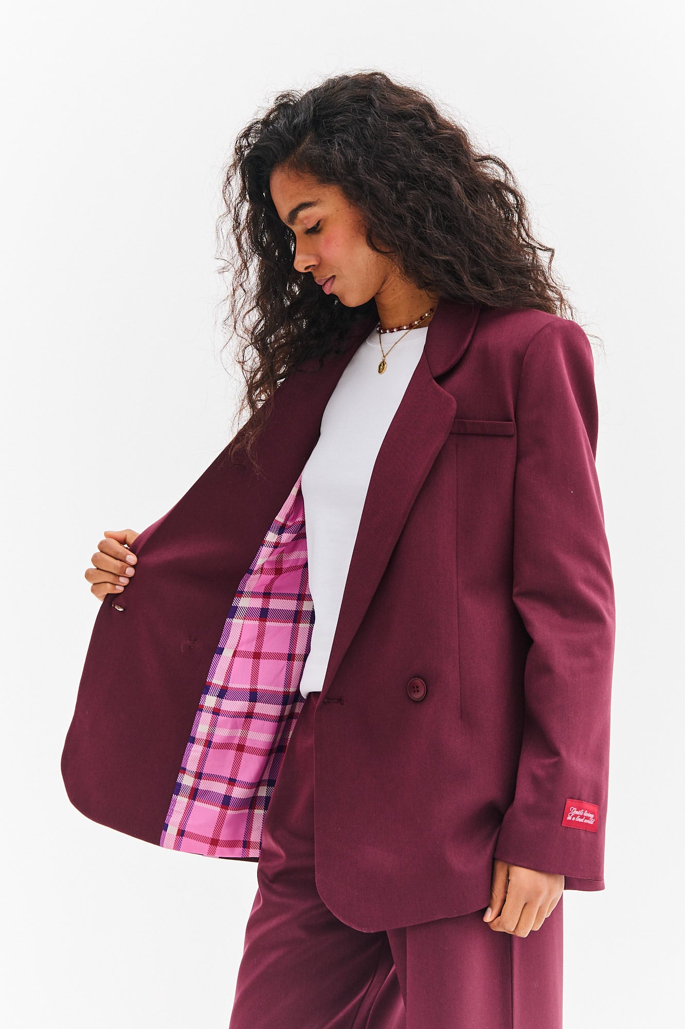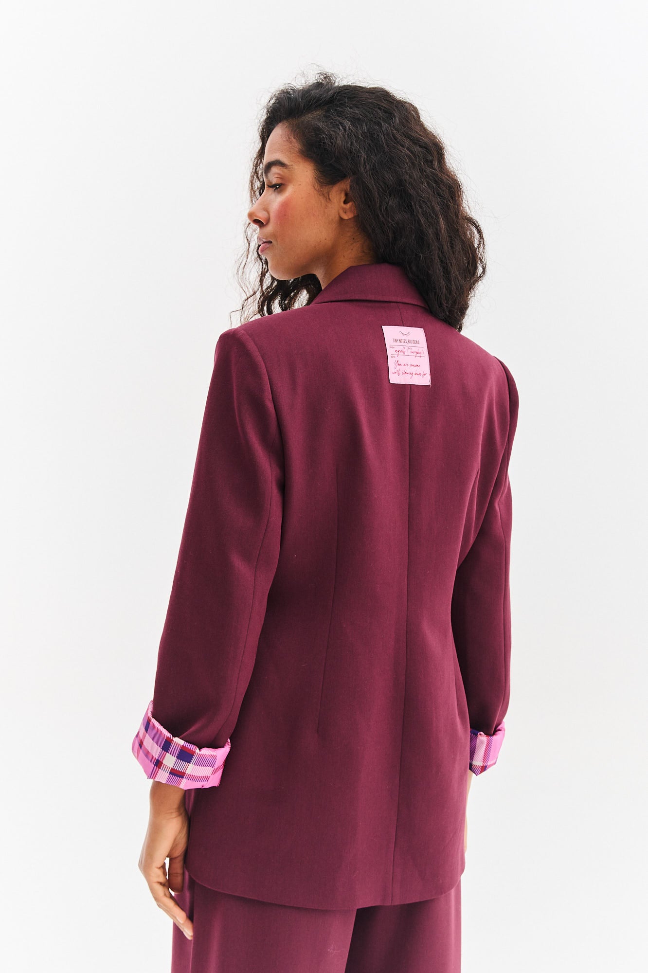Marynarka Kiss the Silence to kwintesencja ponadczasowego stylu. Jej głęboki, bordowy kolor jest niezwykle szykowny, a dopasowany krój pięknie podkreśla sylwetkę. Prawdziwą perełką jest jednak kontrastowa podszewka w odcieniach różu i fioletu, którą możesz wyeksponować, podwijając rękawy.