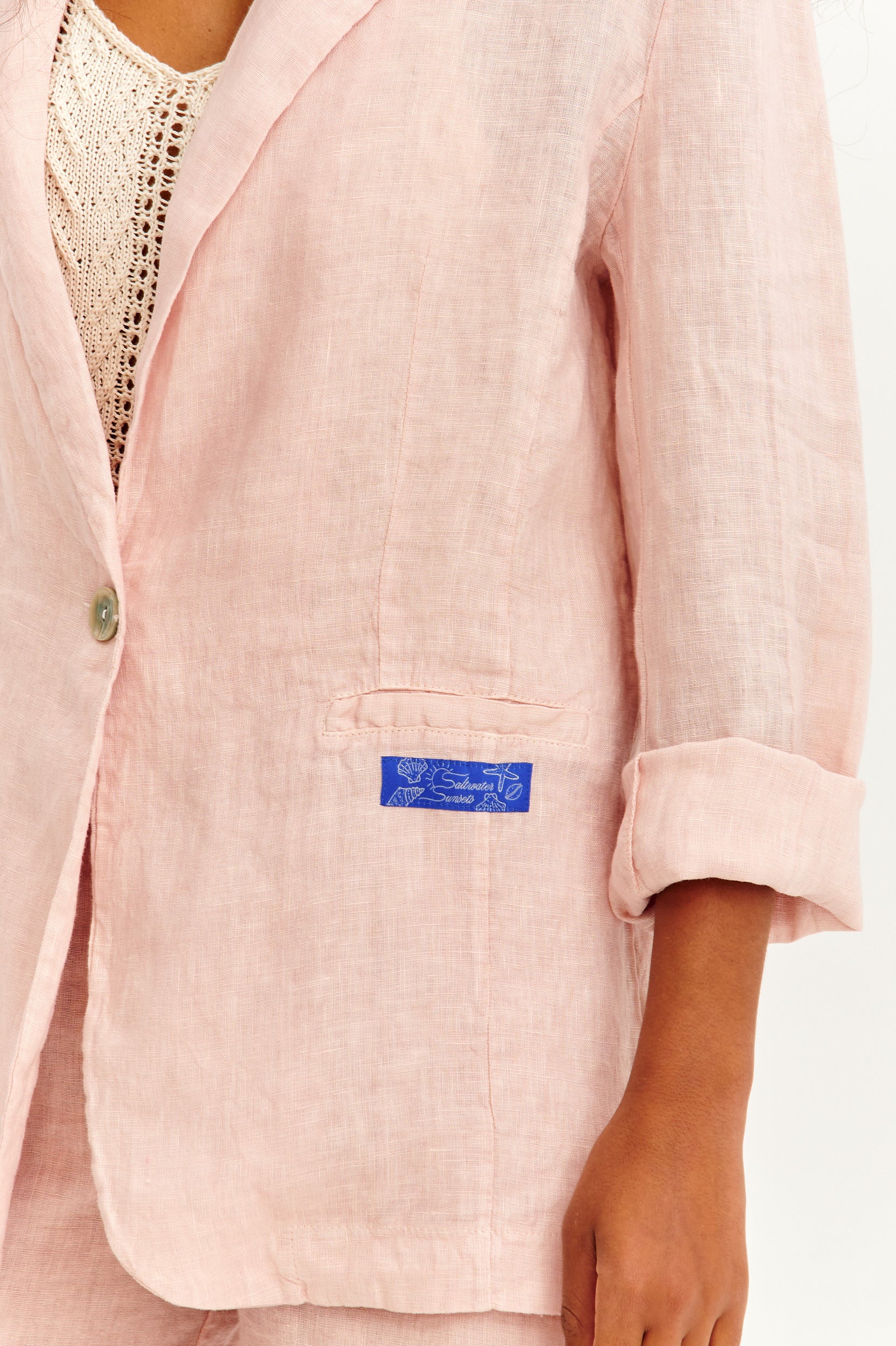 Delikatny róż dodaje romantyzmu i świeżości, a kontrastowa naszywka przypomina o tym, by złapać oddech i nie brać wszystkiego zbyt serio. Noś ją solo lub w komplecie z szortami – Ocean Air to marynarka, która pasuje do każdej wakacyjnej historii.