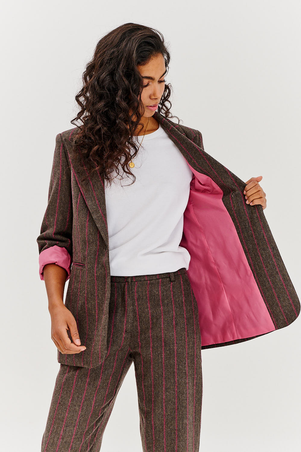 Marynarka Moments in Time to hołd dla ponadczasowego stylu, w którym klasyka spotyka się z subtelną oryginalnością. Wykonana z wysokiej jakości tkaniny w jodełkę z delikatnymi akcentami w odcieniach brązu i różu, emanuje wyrafinowaną elegancją. Jej dopasowany, ale komfortowy krój sprawia, że świetnie układa się na sylwetce, podkreślając jej atuty.